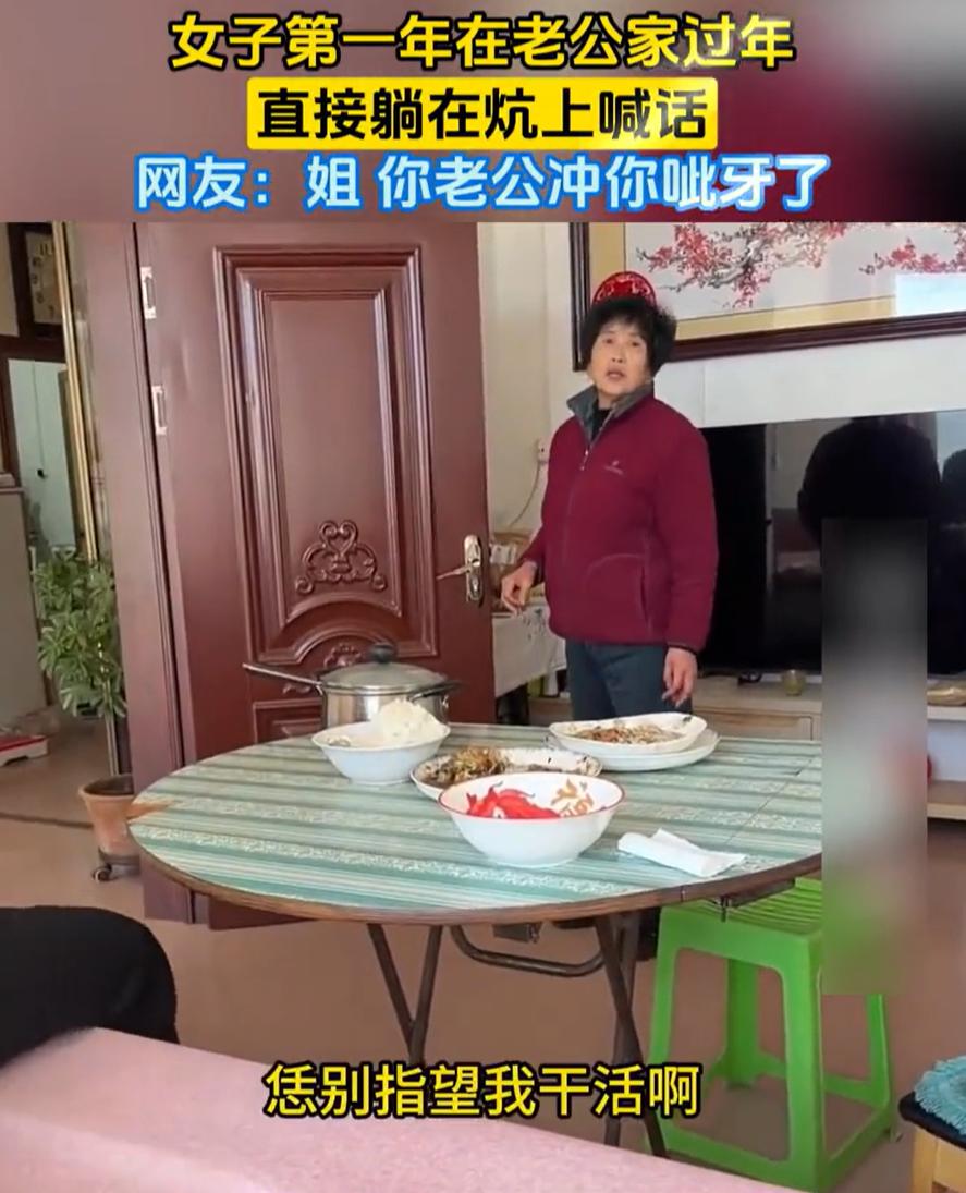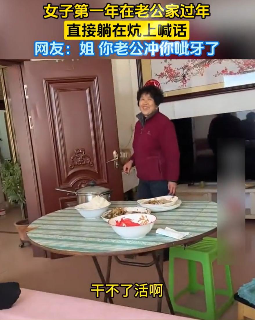 这是真牛!女子第一次去老公家过年,别人都在忙前忙后的准备做饭,可女子却直接躺在炕上,并向所有人喊话:恁们谁都别指望我干活啊,我就在炕上一躺。而喊话结束后,老公和婆婆却都笑了 视频中,女子一边拍视频,一边想婆家人喊话:回家过年了,第一年上老公家来过年,我告诉恁啊,恁都听着,恁别指望我干活啊,我就往炕上一趟,恁谁也别挑理啊,干不了活啊,在家里也没干过活 老公和婆婆听到后,并没有表现出不高兴的样子,反倒是看着她笑了笑,谁也没说什么,又继续去干活了 对此,网友们倒是看法不一 有网友说:婆婆没生气还笑了,善良大度,这儿媳妇儿虽然说懒点,但也是个心直口快的有趣的女人,说明家庭气氛不错 也有网友认为:这也太不懂事了!你真不干婆婆也不能撵你,但你这么喊出来,就只会显得没有教养 其实我倒觉得,女子的喊话有些说反话的意思,她喊话那个劲儿,虽然是宣告不干活,但脸上带着笑,语气里透着一股子不见外的亲热。这哪是下战书啊,这分明是另一种形式的撒娇。她心里有底,知道这个家能容得下她这样 说白了,人家不是去走亲戚的,是回自己家 走亲戚才需要端着、装着、表现着。回自己家,谁还天天把客套挂在脸上?她敢往炕上一躺,敢把丑话说在前头,恰恰说明她没把自己当外人,也说明这个家平时就是这么个松弛的氛围 再看看婆婆的反应。婆婆那一笑,门道可就大了 这一笑,里头起码有三层意思。第一层,是觉得这媳妇有点意思,是个直肠子,不耍心眼,以后好相处。第二层,是一种过来人的宽容,小年轻嘛,懒得干就不干,反正家里也不差她那双筷子。第三层,也是最关键的,这婆婆压根没把干活不干活当成衡量儿媳妇的标准 毕竟每家的相处模式都不一样,一家人开开心心就是最重要的 女子在老公家过年直接躺在炕上喊话