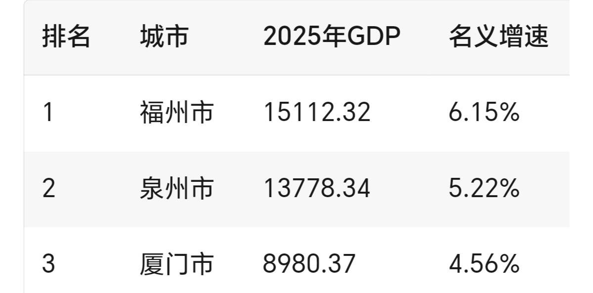 看了一下,福建省2025年的gdp,该省的经济发展,其实是很强劲的。其中省内三巨头:福州、泉州、厦门,gdp在国内都是排名很靠前的。福州15112.32亿,泉州13778.34亿,都是万亿级别的经济大市。作为五大计划单列市之一的厦门,大概率近几年内,也能突破万亿。到时候,福建省的前三甲城市,经济规模都会是万亿级别的。