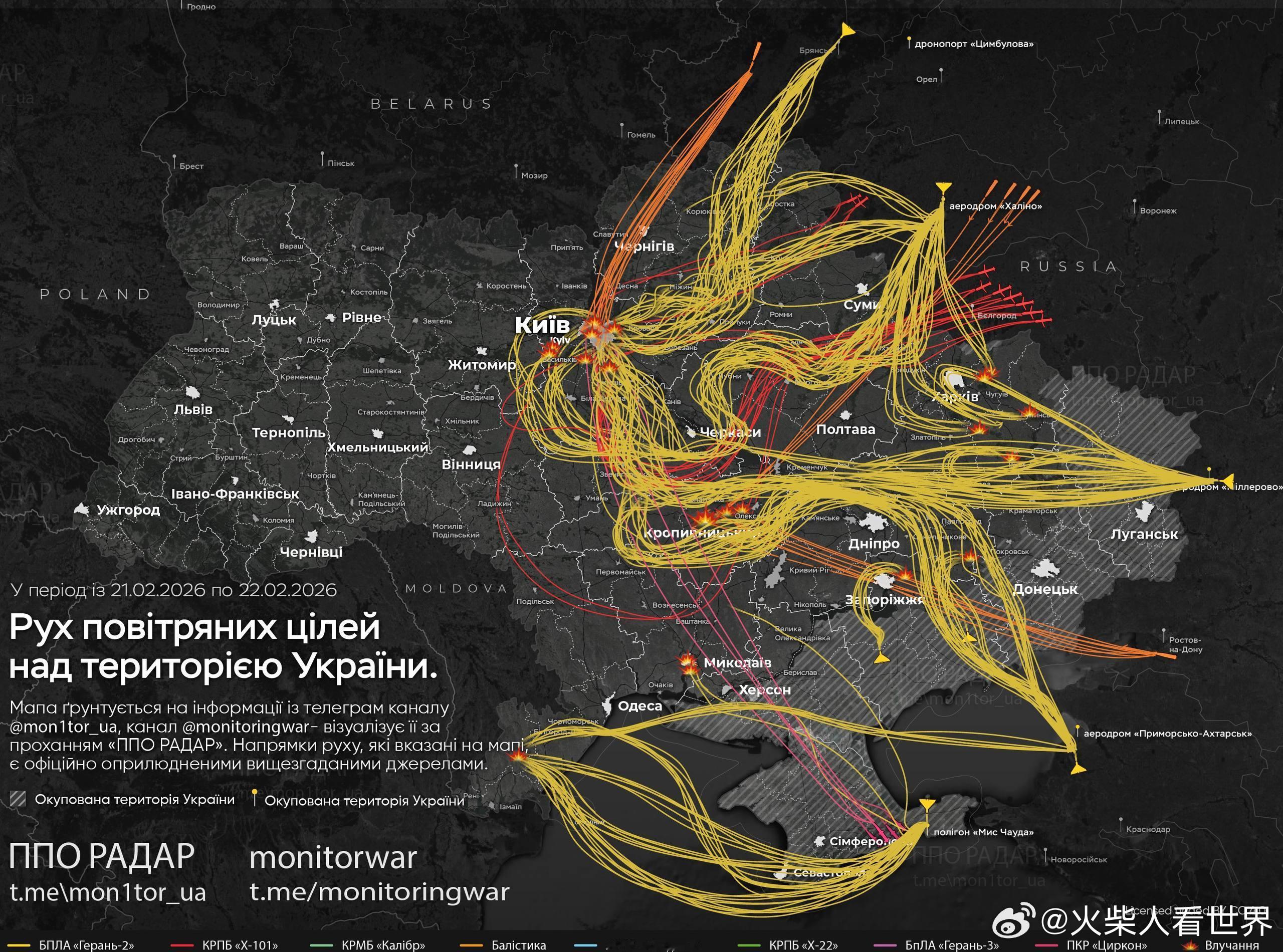 2月22日晚(自2月21日19:00起),俄军使用攻击无人机、空基和海基导弹对乌克兰关键基础设施目标实施了联合打击。乌克兰空军无线电技术部队共记录到345个空中袭击目标: