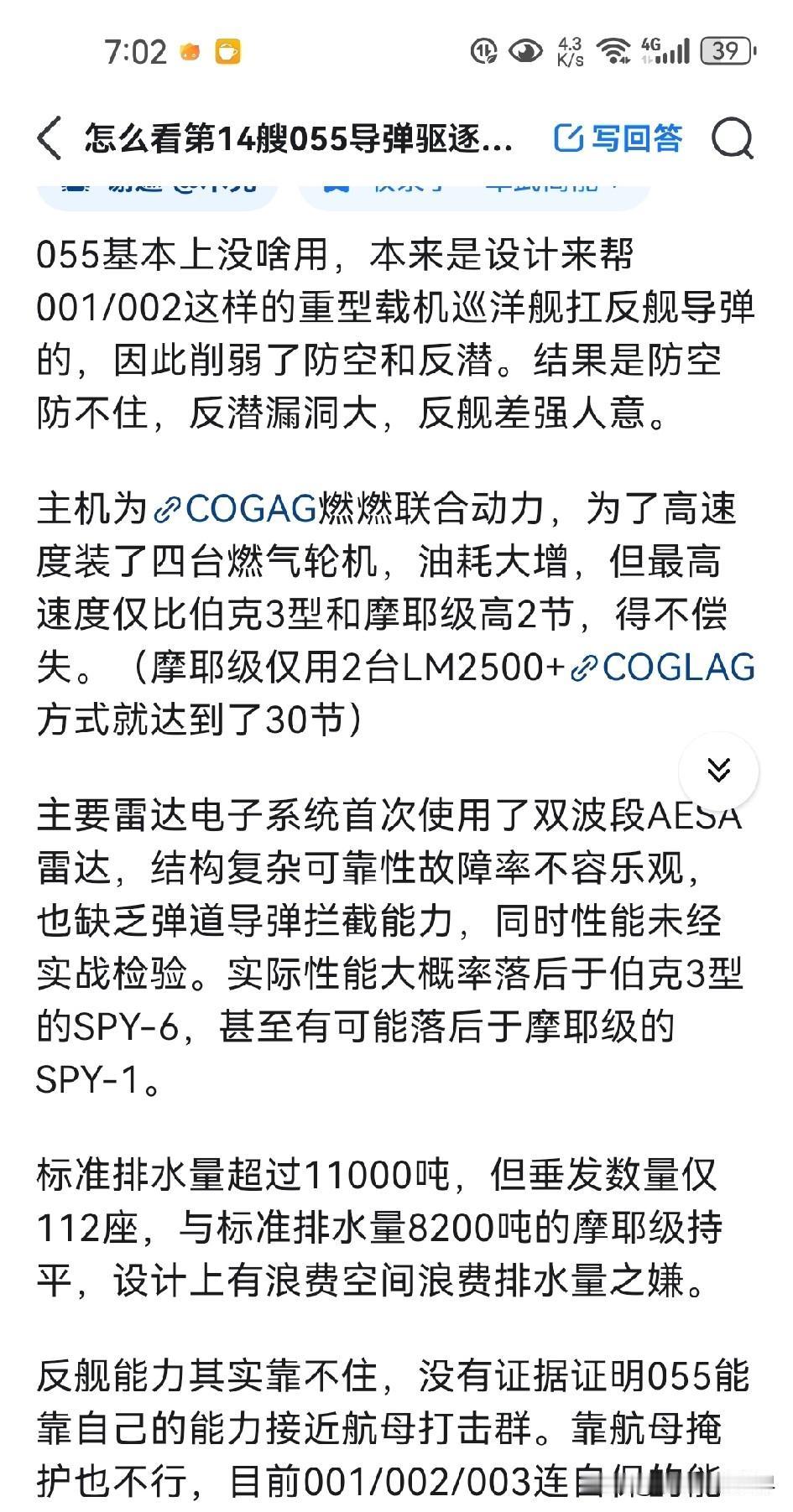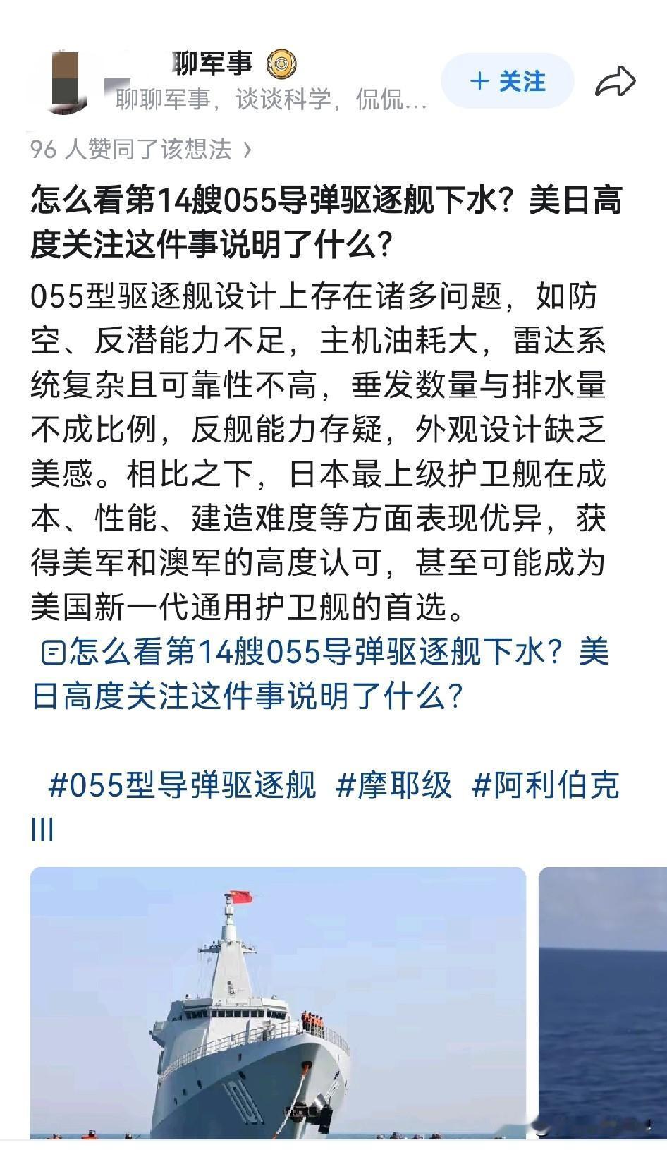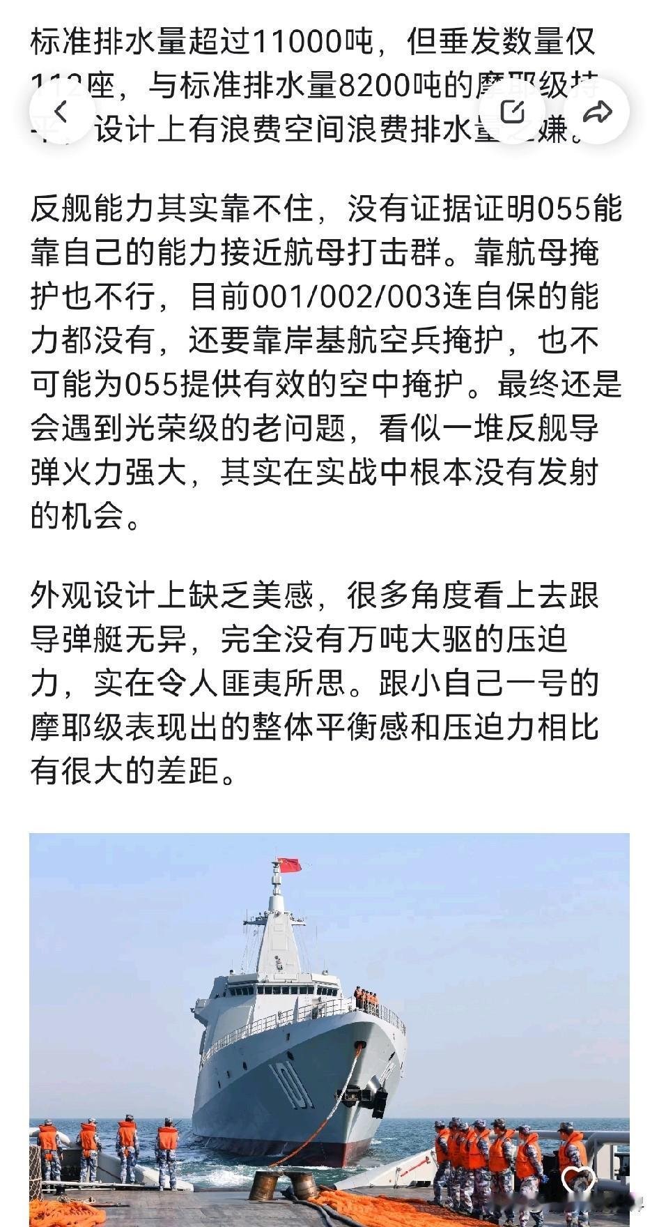 055大驱唯一的作用是帮001/002舰扛反舰弹的,说白了就是055只是一艘会动的盾牌!仅此而已! 他说,055基本上没啥用,设计上存在诸多问题,它的任务就是来帮001/002重型载机巡洋舰扛反舰导弹的,因此削弱了防空和反潜。 (它的意思是055设计初衷就是作为001/002的“盾牌”来使用,就是用自身来硬抗来袭导弹以保全己方军舰安全) (你别说,这个解析还真挺另类。) (我在网上看过太多对055的解析,但像这么没有一点逻辑思维的歪门邪道解析,还是首次见) 它说,055型驱逐舰防空、反潜能力不足,主机油耗大,雷达系统复杂且可靠性不高,垂发数量与排水量不成比例,反舰能力存疑,外观不美感。相比之下,日本最上级护卫舰在成本、性能、建造难度等方面表现优异,获得美军和澳军的高度认可,有可能成为美国新一代通用护卫舰的首选。 (总结一句话,在他眼里055哪哪都不行,唯一能进他眼里的雷达,复杂可靠性不足) (他也承认055雷达电子系统是世界海军史上首次采用双波段AESA的军舰,但是,其系统太过复杂,故障率不好说,且没有经过实战考验,也缺乏对弹道导弹的拦截,所以他认为这个雷达不实用,不如伯克3型SPY-6性能好,甚至有可能也落后于摩耶级的SPY-1雷达) (真特么服了) (就连美国那些军事专家,虽然他们对055也挑了好多毛病,但也不敢说,055雷达性能落后美军) (这货是真敢说) (当然了,挑毛病批评,很正常,只要本着科学的精神,客观的评论,挑剔,没什么问题,但你不能闭着眼胡说八道) (一方面把055贬得一无是处) (转头却把日本最上级吹的乌丢乌丢的,还说什么美澳两家可能采购这最上级) 说完雷达,咱们再说主机。 055大驱主机为 COGAG燃燃联合动力,虽然动力强劲了,航速提高,但带来的却是油耗大增,且最高速度仅比伯克3型和摩耶级高2节,所以他认为这么做得不偿失。 日本摩耶级仅用2台LM2500+ COGLAG方式就达到了30节。 (日舰这种燃电推进方式,有一说一,是不错,没毛病。) (但它没有说的是,摩耶级可不是只有2台LM2500燃气轮机,他还有两台发电燃气轮机和2台推进电机,说白了,他用的也是四台燃气轮机,只不过有两台燃气轮机是发电以推进电机使用) (055是4台燃机,单台3.8万马力,总超15万马力) (美日的LM2500单台3.4万马力左右) (他猜测055油耗高,是不是对我不知道,这个应该只有厂家和那个军舰上的官兵才知道,我不知道他作为一个普通人怎么知道这个数据) 批完雷达,它又指向排水量。 他说055标准排水量就超过11000吨,但垂发数量仅112座,与标准排水量8200吨的摩耶级持平,所以他认为设计上有浪费空间浪费排水量之嫌。 (要是按照他这个标准评判,俄罗斯千吨巡逻舰上面都装了8个垂发,可以打巡航导弹,那是不是比她的摩耶级还强?) (垂发不能光看数量多少,还要看起通用性,垂发单元口径大小,以及军舰内部的空间大小,人员居住环境,弹药、油料储存量多少……) 最难崩的是,他说055反舰能力靠不住。 理由是没有证据证明055能靠自己的能力接近航母打击群。靠航母掩护也不行,因为目前001/002/003连自保的能力都没有,还要靠岸基航空兵掩护,也不可能为055提供有效的空中掩护。最终还是会遇到光荣级的老问题,看似一堆反舰导弹火力强大,其实在实战中根本没有发射的机会。 (055发射YJ-21的视频,全网都可搜看,射程1500公里的高超音速导弹,这么一个大长腿,那还用得着靠近航母再打) (拿一艘爷爷辈的光荣级导弹巡洋舰跟21世纪的055比,他真有意思) (在他眼里,咱家的那三艘航母跟055就是个摆设,因为你不能离开海岸线,必须在岸基航空兵的保护下才行,不然离开了就是死路一条) (就他聪明,看得远,其他人都是傻子,这也不行,那也不行,那我们建这些干啥呢?) 批055颜值不行,缺乏美感。 他称055外观设计上缺乏美感,很多角度看上去跟导弹艇无异,完全没有万吨大驱的压迫力,实在令人匪夷所思。跟小自己一号的摩耶级表现出的整体平衡感和压迫力相比有很大的差距。 (美感不美感,这个咱且不说,每个人对审美都有自己的理解,审美不同,这个没法统一) (他说055压迫感不强,没有万吨大驱的那种威压感。) (一个是他没有见过055驱逐舰的真面目) (二是他在网上搜的055图片,应该都是那种抽象的卡通版图片) (说实话,这个还真不能全怪他,咱们军宣拍的那个照片确实抽象) 某乎上看的一个帖子,一开始我以为它是反串,翻了下它的主页,再看IP(日本)明白了。