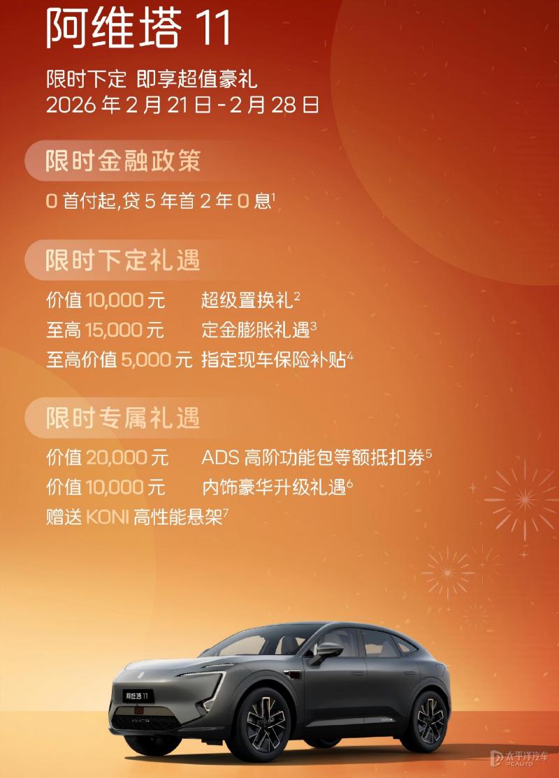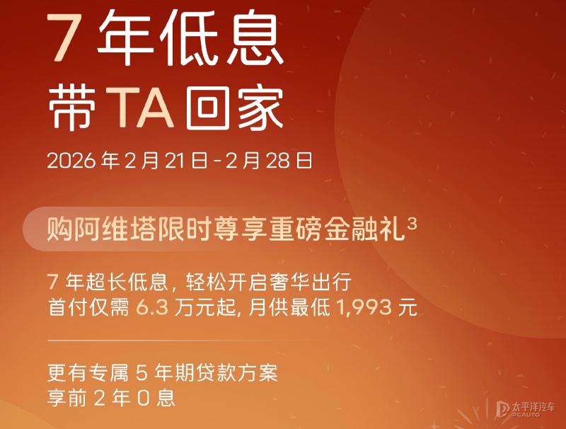 近日,阿维塔宣布推出重磅限时金融礼遇,即日起至2月28日,消费者下定阿维塔旗下多款车型,即可享受7年超长低息金融方案,月供低至1993元。