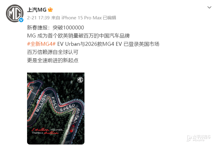 近日,上汽名爵官方宣布,其MG品牌在欧洲及英国市场的累计销量已突破一百万辆,成为中国首个达成这一历史性成就的汽车品牌。