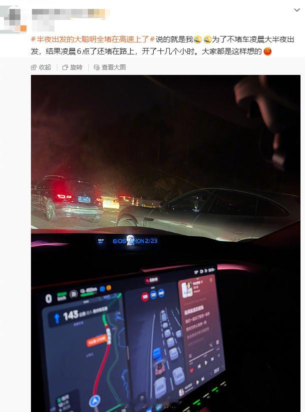 半夜出发的大聪明全堵在高速上了【今日高速车流量超6600万辆次!上了高速发现全是聪明人 半夜出发的都堵哭了】春节假期最后一天,全国多地高速公路出现大规模拥堵。“19点出发到家得凌晨5点”“每个服务区都堵到怀疑人生”,不少网友自嘲“提前出发避堵”的聪明人策略集体失效,导致高速车流激增。 (快科技)