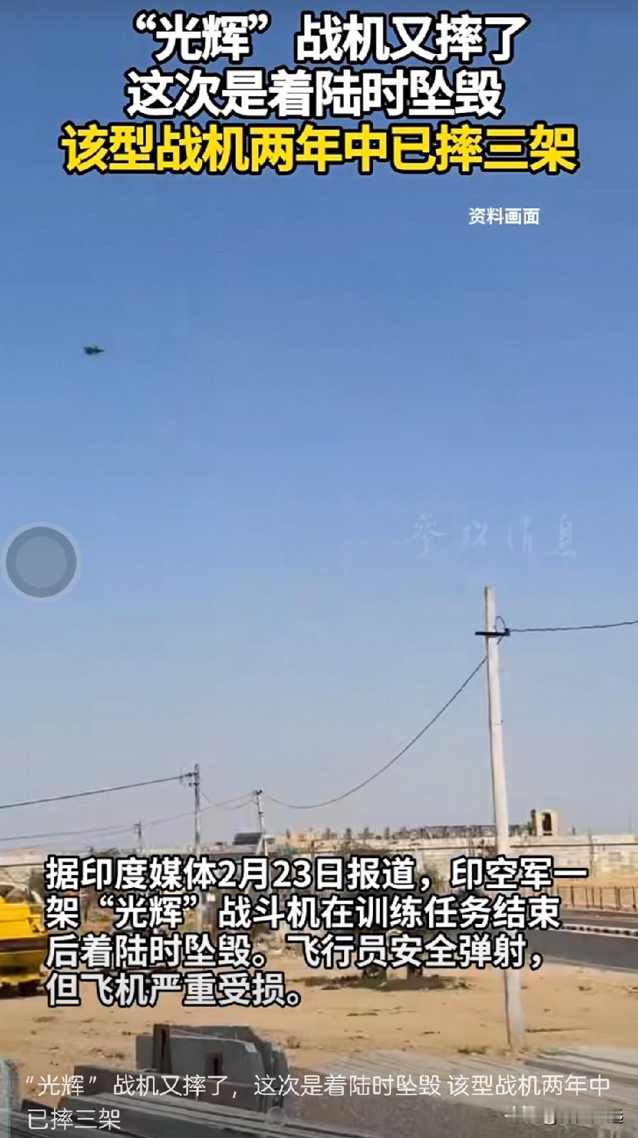 最新!印度光辉战机又摔了,两年四摔,总共才30架,摔了13%,世界第一! 2月23日,印度又一架光辉战机刚训练完着陆就出事,飞机报废,飞行员弹射逃生受轻伤。 2月7号刚摔过一架,印军把全部单座光辉停飞排查,结果停飞期间又摔一架,这质量也是没谁了。 捋捋这两年光辉战机的完整“战绩”: 2024年3月12日,印度拉贾斯坦邦杰伊瑟尔梅尔,参加“印度力量”联合演习训练期间发动机燃油泵故障坠毁,飞行员安全弹射,战机彻底摔毁。 2025年11月21日,阿联酋迪拜航展,飞行表演时低空失控坠地,飞行员纳曼什·西亚尔中校未能弹射,当场殉职,全球直播丢大脸。 2026年2月7日,印度国内前线空军基地,训练着陆刹车失灵,冲出跑道坠沟,机身近乎报废,飞行员安全弹射,印军随即停飞全部单座光辉。 2026年2月23日,印度国内空军基地,停飞排查期间训练着陆,机载系统/飞控异常坠毁,机身报废,飞行员弹射逃生,轻伤。 号称印度国产骄傲搞了40年才服役,核心部件全靠进口,印度斯坦品控拉胯,系统整合一塌糊涂。 30架机队两年摔4架,坠机率在三代机里世界第一[赞]。印度空军南波万。