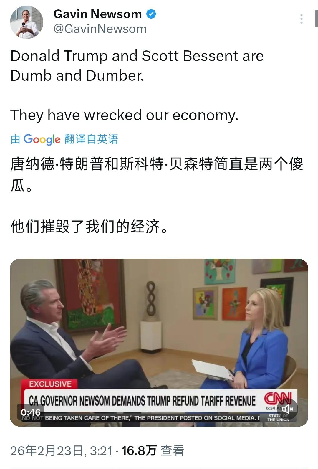 美国加利福尼亚州州长纽森今天(2月23日)写道:“唐纳德.特朗普和斯科特.贝森特简直就是两个傻瓜。他们摧毁了我们的经济。”纽森在接受CNN采访时还表示:“特朗普和贝森特一个比一个愚蠢,这届政府正在摧毁一切:上季度GDP增速仅为1.4%,通胀率升到3%,劳动力市场是2013年以来最差的一年。全年GDP增速2.2%,而他接手时是2.8%。他的那套经济模式就是大规模驱逐移民、给亿万富翁减税以及对世界各国加征关税。他已经被戳穿了,就是一个骗子,他甚至利用加征关税中饱私囊。” 美国高院裁定特朗普的关税政策违法,作为民主党的政治新星,纽森不失时机攻击特朗普。除过语言不太文明外,纽森发布的经济数据基本属实。此外,纽森还对特朗普的用人制度进行抨击,即为了打造“总统帝国”,其核心幕僚的选用是建立在对老板绝对忠诚之上,而不是个人的工作能力和经验,无论特朗普的言论多么荒诞,其内阁成员都能为其辩解。但也有例外,特朗普刚刚吹嘘完通过他的加征关税政策,使美国的贸易逆差减少了78%,美国商务部即发布数据,2025年美国的商品贸易逆差达到创纪录的1.2409万亿美元,比上年度增加255亿美元,直接揭穿了特朗普的谎言。