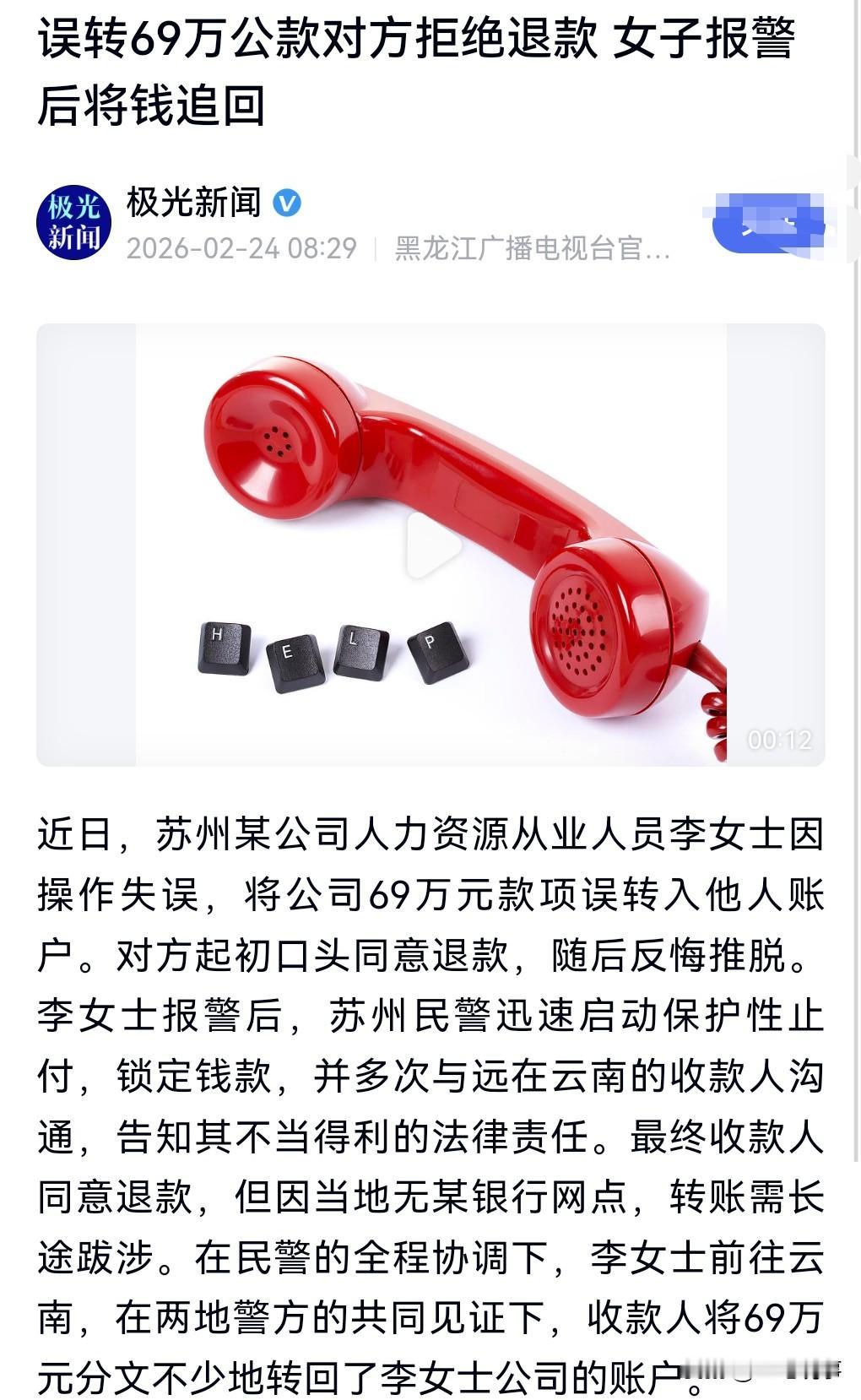 转钱的时候一定要核对好账号,要不然打到别人卡里就麻烦了。 2月24日热搜,误转69万公款,对方拒绝退款。 看来对方是见钱眼开了。 刚开始的时候答应的好好的说会退,后面利欲熏心想吞下这笔钱。 转款方只好选择报警,在民警的教育和警告下,对方只得乖乖退钱。
