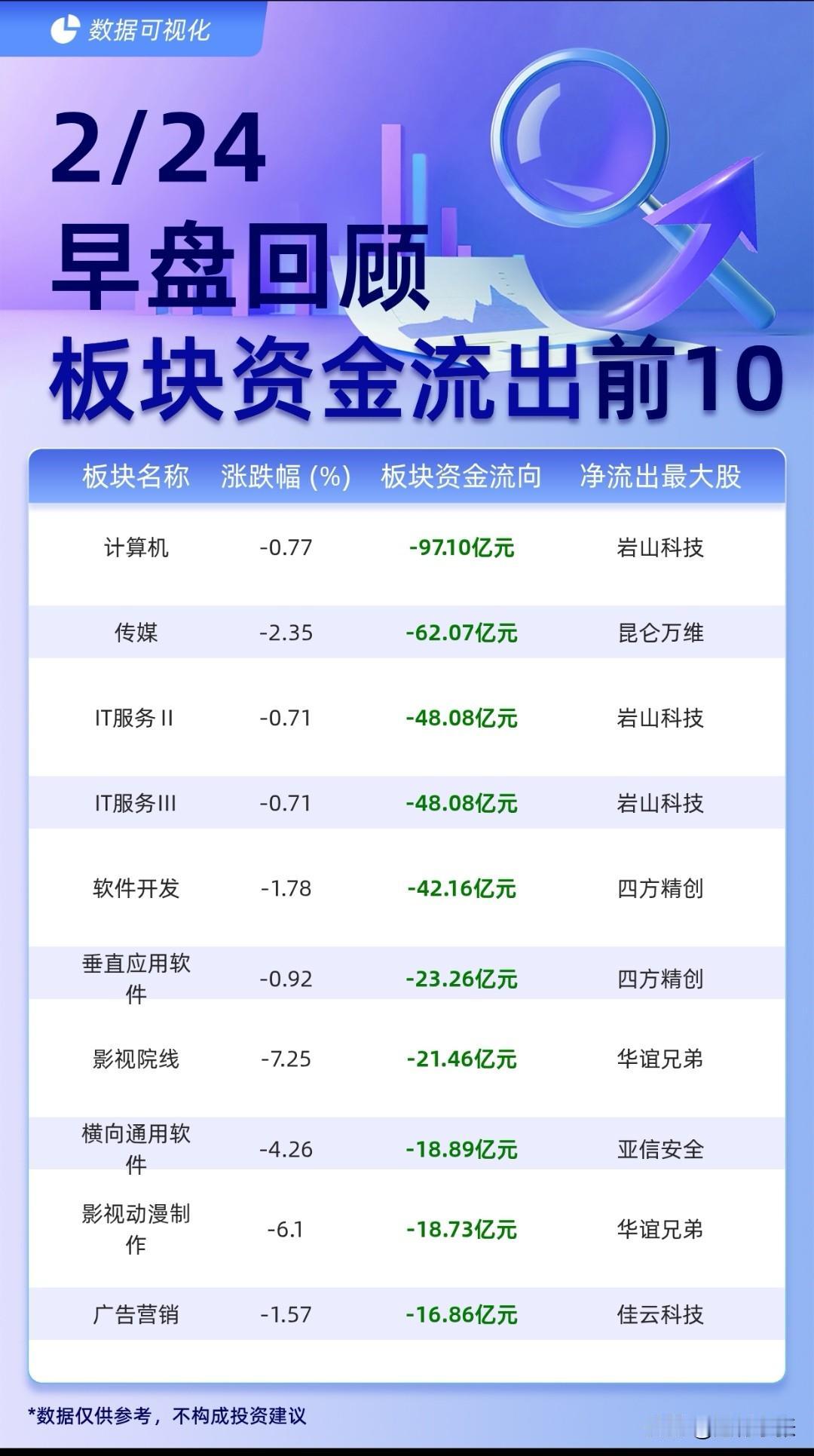 2月24日马年第一个交易日早盘资金流向揭晓,市场跷跷板效应显著! 电子板块以80.30亿元净流入领跑,沪电股份成资金宠儿。 通信设备、有色金属等赛道同步获资金加仓,硬核科技与周期方向齐发力。 反观流出端,计算机板块净流出超97亿元居首,传媒、IT服务等板块资金出逃明显,岩山科技、昆仑万维分别成为各自板块资金流出主力。 资金高低切换特征凸显,硬核科技接棒,高位题材暂歇,布局思路需顺势调整。