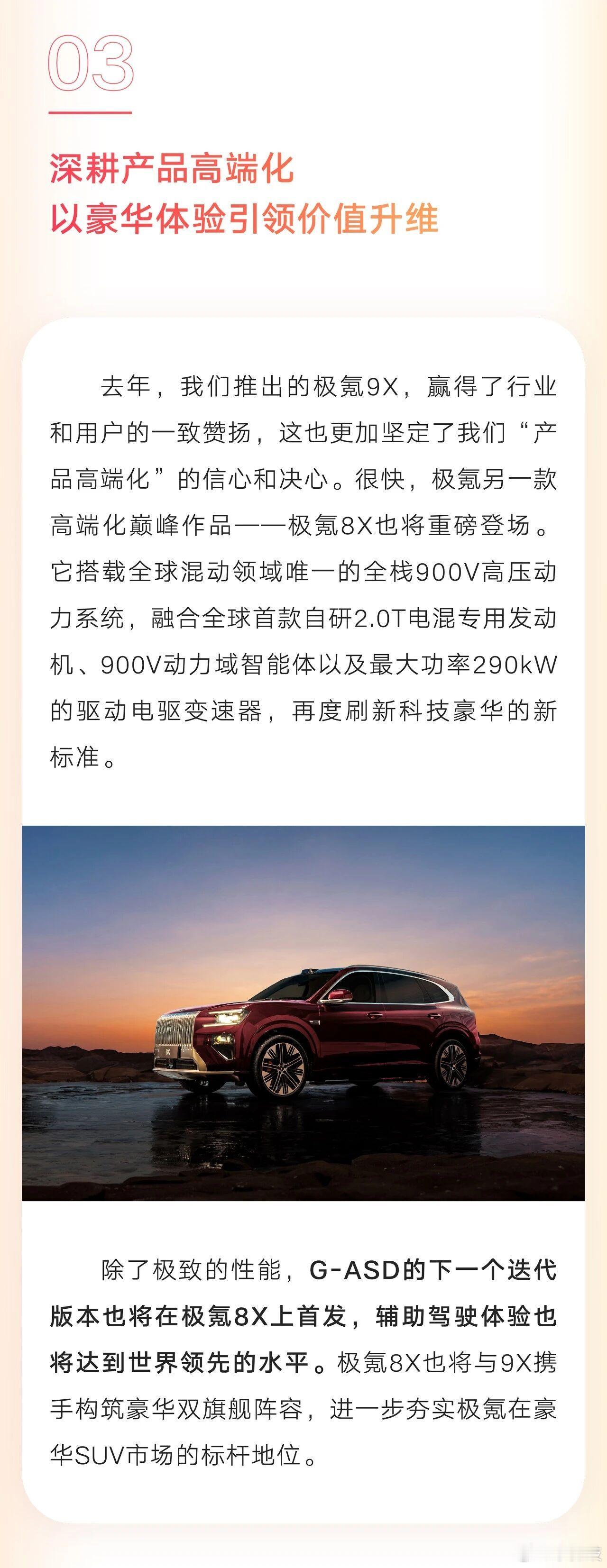 吉利汽车官宣:高阶辅助驾驶千里浩瀚H7将应用到全集团更多车型,极氪8X首搭G-ASD新版本!正月初八开工第一天,吉利汽车集团CEO淦家阅(阿甘)在新春贺词中披露集团智能化推进节奏与产品落地安排,强调以“技术普惠、长期主义”应对更趋激烈的市场竞争,并提及2026年竞争强度将进一步提升,坚持正确价值观,避免陷入内卷式恶性竞争,走内涵式、可持续发展路径。并对外公布两项核心进展:1、 “千里浩瀚H7”加速下放:高阶辅助驾驶方案将应用至全集团更多车型,重点覆盖更多领克车型,并延伸至吉利银河相关车型。 2、G-ASD新版本首发车型确认:G-ASD辅助驾驶系统下一版本将由极氪8X首发,极氪8X将成为首个搭载该版本G-ASD的产品。极氪8X淦家阅表示,将在坚持价值观与长期投入的基础上,推动核心智能化能力更大范围普及,以更稳健的方式穿越未来竞争周期。