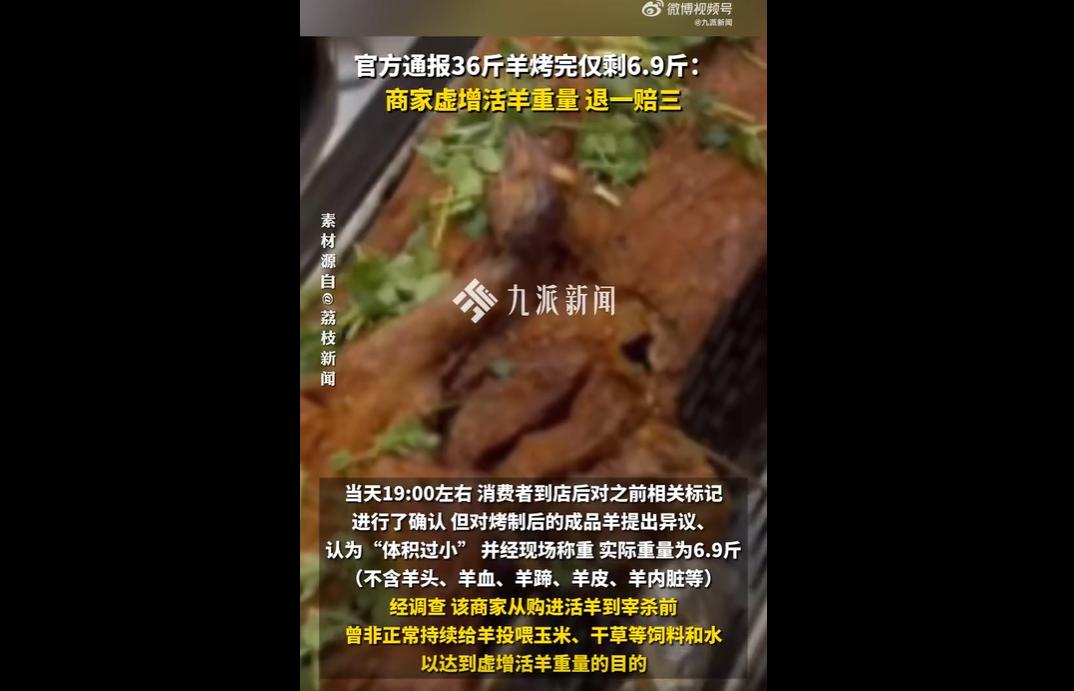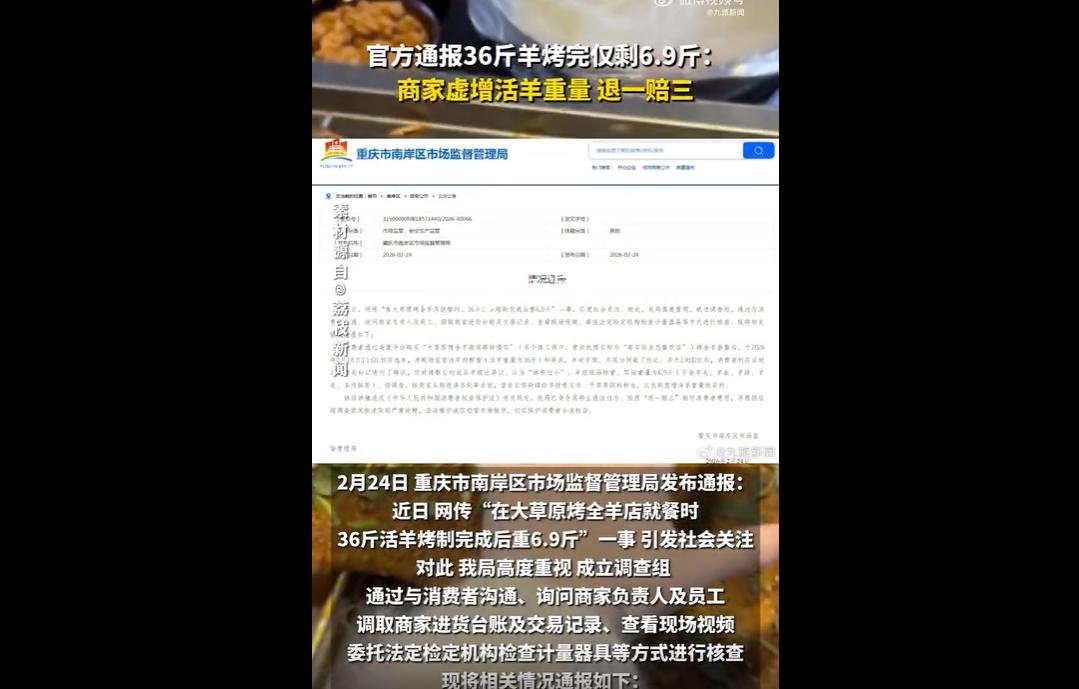 近日,重庆南岸区市监局通报,消费者现场监督36斤活羊宰杀标记,烤后仅6.9斤。 经查商家宰杀前蓄意投喂虚增重,违反消法,被责令退一赔三并将依法追责。 36斤活羊,烤完只剩6.9斤,损耗率高达81%! 这不是正常的烹饪缩水,而是一场精心策划、明目张胆的商业欺诈,是商家对消费者智商的公然践踏,更是对法律与诚信的彻底漠视,每一个细节都令人愤怒到发指! 消费者王女士满心欢喜购买烤全羊套餐,全程现场监督活羊称重、宰杀,还特意给羊腿、羊尾做了标记,本以为层层设防就能避免被坑,却终究没能逃过商家的黑心算计。 从选羊到宰杀,她步步谨慎,可商家早已在暗处布下陷阱——从购羊到宰杀前,持续非正常投喂玉米、干草和水,只为虚增活羊重量,把本就不足36斤的羊,硬生生“灌”到标准重量,用虚假的重量骗取高额套餐费,其贪婪与狡诈,令人不齿。 更离谱的是成品羊的重量,6.9斤的数字,刷新了商业欺诈的下限! 据行业常识,活羊宰杀去头蹄、皮毛、内脏后,胴体出肉率可达45%-55%,36斤活羊对应胴体重量应为16-20斤,即便经过烤制脱水,再缩水30%-40%,成品合理重量也该在10-14斤之间。 而商家给出的6.9斤,仅占活羊重量的19%,相当于把一只羊烤成了“羊肉干”,这根本不是正常烹饪能达到的损耗,明眼人都能看出,其中必然存在食材调包、截留的猫腻。 面对铁证如山的欺诈事实,商家的狡辩更是苍白又嚣张。 一会儿说“羊爱运动导致缩水”,一会儿辩称“烤制过干”,可这些谎言,连最基本的常识都站不住脚——再爱运动的羊,也不可能凭空消失29斤重量;再烤得干的羊肉,也绝不会薄如纸、羊腿细如鸭腿。 更令人愤怒的是,消费者发现异常要求复称时,商家竟公然拒绝,直到警方介入,才被迫称重,其底气之足,仿佛早已习惯了这种欺诈行为,丝毫没有意识到自己的所作所为已经触犯法律、违背良知。 这场欺诈事件,从来都不是单一商家的个别行为,更折射出部分餐饮行业的乱象。 一些无良商家,为了追求利润最大化,不惜铤而走险,用虚假宣传、缺斤短两、恶意欺诈等手段敛财。 万幸的是,市场监管部门的处置及时且有力,责令商家停止违法行为、按“退一赔三”赔付,并将依法进一步追责,这一处罚,大快人心,也给所有无良商家敲响了警钟:法律不是摆设,消费者的权益不容侵犯,任何试图通过欺诈手段敛财的行为,终将受到法律的严惩。