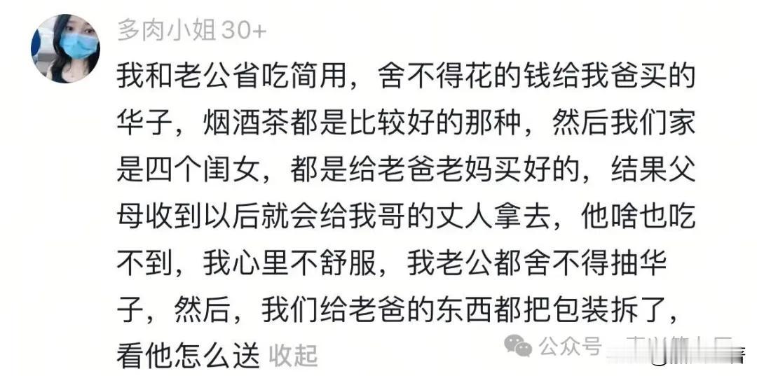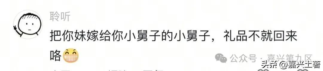 仔细一看,嘉兴有人被小舅子老婆发的朋友圈惊呆了!给老丈人买的烟酒、东西,转眼去了这里?有人却说:流水席、循环! 过年都要回娘家, 大包小包带着一堆东西, 但是不少人发现, 送的东西命运多舛! @第九区网友爆料: 小舅子老婆发朋友圈, 说要回娘家, 仔细一看,惊呆了! 烟酒都是我买给老丈人的, 原封不动送到小舅子老丈人家! 有人表示: 自己拿回娘家的东西, 都会到别人手里! 有人表示: 放心吧,小舅子的老丈人家, 还会再送出去! 还有人表示: 无所谓,老丈人家也要买的, 还得是老丈人出钱! 对此你怎么看? 评论区说说!