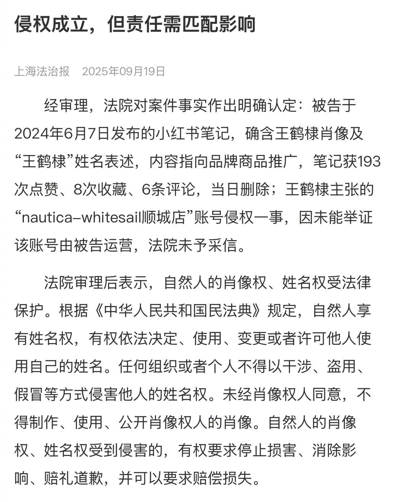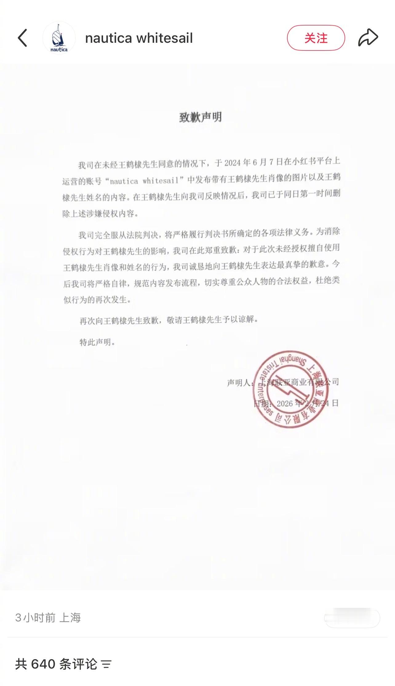 王鹤棣穿了品牌的衣服被品牌发贴认领,然后王鹤棣把品牌方告了,品牌方道歉