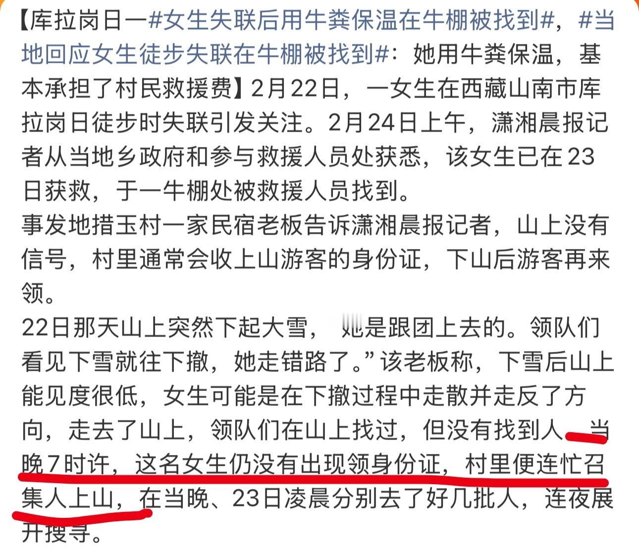 这个新闻还挺好的,好几个点既温暖又体现了专业第一、对这种有危险的上山,会收上山人员的身份证,在一定时间没来领取,立马就组织了人上山救援第二、走失的女生有丰富的经验。利用牛粪和牛棚保温等措施,才能保证自己在寒冷的天气存活等待救援。不像很多新闻里面的徒步爱好者,毫无经验就敢去挑战未知的风险第三、被救援的女生承担了救援的全部费用,这个点更应该广而告之。承担风险救援,就应该获得相应的报酬。而且这个费用就该被救援的人承担。