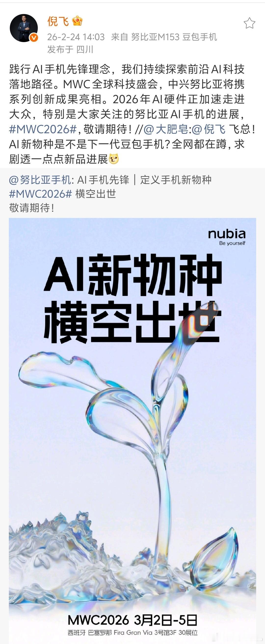 倪飞疑似透露新一代豆包手机进展努比亚倪飞称MWC官宣AI手机进展相信大家对第一代豆包手机印象十分深刻,更是一机难求,而根据最新消息,字节跳动正全力布局AI手机赛道,第二代豆包手机预计2026年年中面世,初代豆包手机与努比亚合作,开售即售罄。
