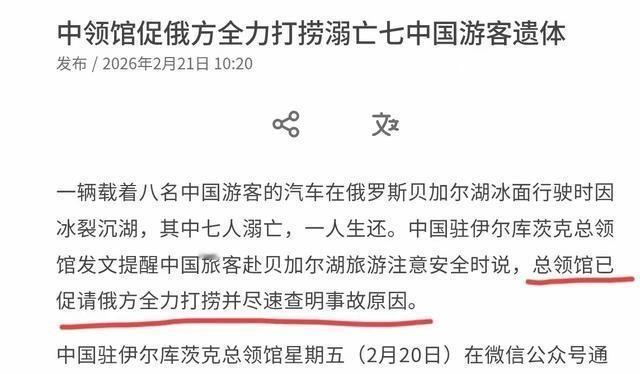 中国对俄罗斯施加压力了!俄罗斯对此事要认真处理! 2月21日,俄罗斯贝加尔湖发生一起严重事故,一辆载有八名中国游客的越野车在冰面上行驶时冰层破裂,整车沉入湖底,造成七名中国游客溺亡,一名司机也遇难,只有后排一名中国游客生还。这件事曝光后,中国驻伊尔库茨克总领馆反应很快,当天就启动应急机制,直接联系俄方,要求全力组织救援打捞工作,同时尽快查清事故原因。总领馆的表态很明确,敦促俄方认真对待,不能敷衍。 贝加尔湖是世界最深的淡水湖,最深处超过1600米,水下环境复杂,冰面下经常有肉眼看不见的裂缝和隆起的冰脊,这些地方冰层特别薄,承重能力很差。2026年2月,当地气温出现异常波动,先是暖到零上几度,又迅速降到零下20度左右,这种“过山车”式的天气变化让本来就脆弱的冰面变得更不稳定。事故发生前,当地政府已经把事发路段列为禁行区,竖了禁止车辆通行的牌子,官方冰上通道也没开放。 涉事司机尼古拉·D,44岁,布里亚特族,住在奥利洪岛附近的马利胡日尔村。他以前当过儿童足球教练,后来转行私下接散客,用自己的UAZ面包车带游客上冰面看蓝冰和霍博伊角景观。他没有任何客运资质,也没有旅游从业许可,属于典型的非法运营“黑车”。这次他接了这八名中国散客的单子,价格便宜,游客图省钱和灵活,就选了他的车。结果他明知禁行区还硬闯,看到前方裂缝不但没刹车,反而加速想冲过去,直接导致冰面崩塌,车辆坠湖。 这已经是2026年短短一个月内,贝加尔湖发生的第二起涉及中国游客的重大冰面事故。为什么类似悲剧接连发生?根子还是出在旅游管理跟不上客流增速。中俄团队旅游互免签证政策落地后,中国游客去俄罗斯特别方便,尤其是远东和西伯利亚地区,人数暴增。贝加尔湖这种偏远景区,本来基础设施就薄弱,监管更跟不上节奏。非法越野车到处跑,通过微信群、朋友圈、小红书低价揽客,没保险、没资质,安全完全靠运气。正规的气垫船或者有牌照的旅游车虽然贵一些,但路线固定,有基本保障,很多游客却偏偏选便宜的“野路子”,结果把命搭进去。 事故发生后,中国驻伊尔库茨克总领馆没耽搁,第一时间跟俄当地部门沟通,要求把救援放在首位。俄联邦侦查委员会迅速介入,以“提供不符合安全要求的旅游服务致多人死亡”和“玩忽职守”罪名立案,对司机行为启动刑事调查。当地旅游部门也下令,南北冰上路线全部关停,严禁任何车辆再上湖。救援队21日用潜水设备和水下摄像头定位了沉车位置,成功打捞出全部八具遗体,包括七名中国遇难者和司机本人。俄罗斯外交部和外长拉夫罗夫公开向中方表达慰问,表示会把调查结果及时通报,不会拖延。 这件事暴露的问题很现实:旅游热潮来了,安全底线不能丢。中国游客越来越多,出国玩的欲望强,但很多时候安全意识没跟上。贪便宜、图刺激、信“老司机”经验,这些心态在贝加尔湖这种极端环境下特别危险。冰面不是陆地公路,裂缝随时可能出现,气温一变就翻脸。司机无证运营、游客不选正规渠道,两边都有责任,但归根结底,生命只有一次。 中方这次施压不是空话,总领馆直接推动俄方加快打捞和调查,体现了领事保护的力度。俄罗斯方面也表态积极,至少表面上没推诿。后续调查结果出来后,估计会进一步明确责任划分,也可能推动当地加强旅游车辆监管和冰面安全预警。希望这些血的教训能让更多人记住,出门玩归玩,安全回家才是硬道理。别让“诗和远方”变成“冰和深渊”。