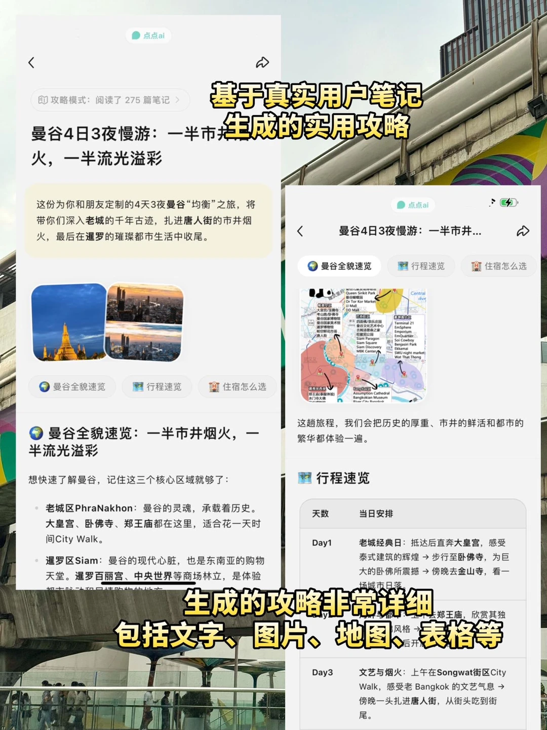 点点是自己的官方ai,有大量真实的用户经验,来之前没做攻略,不知道哪里拍照出片?还好它10秒种就给我生成了一份完整的曼谷摄影攻略