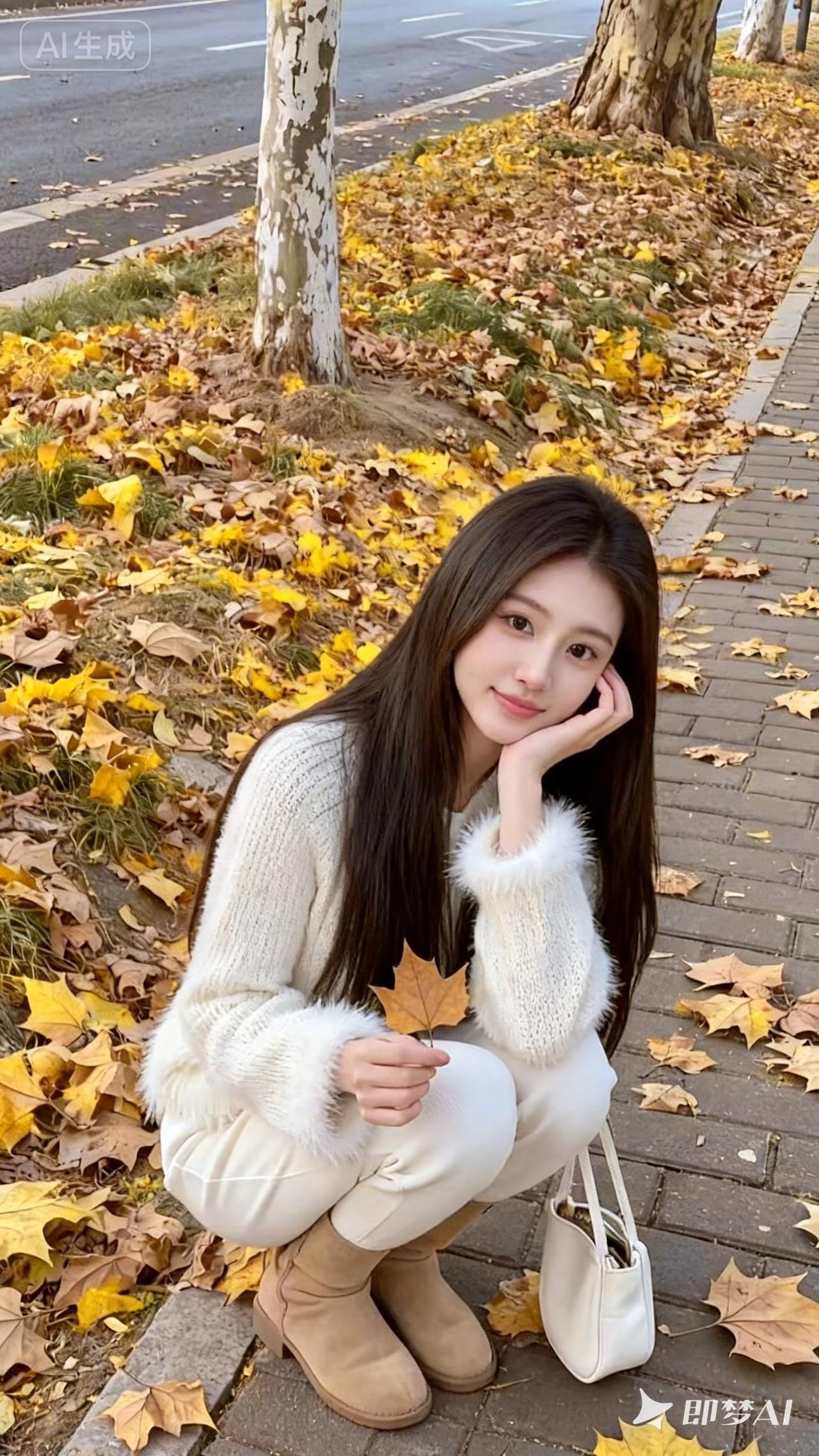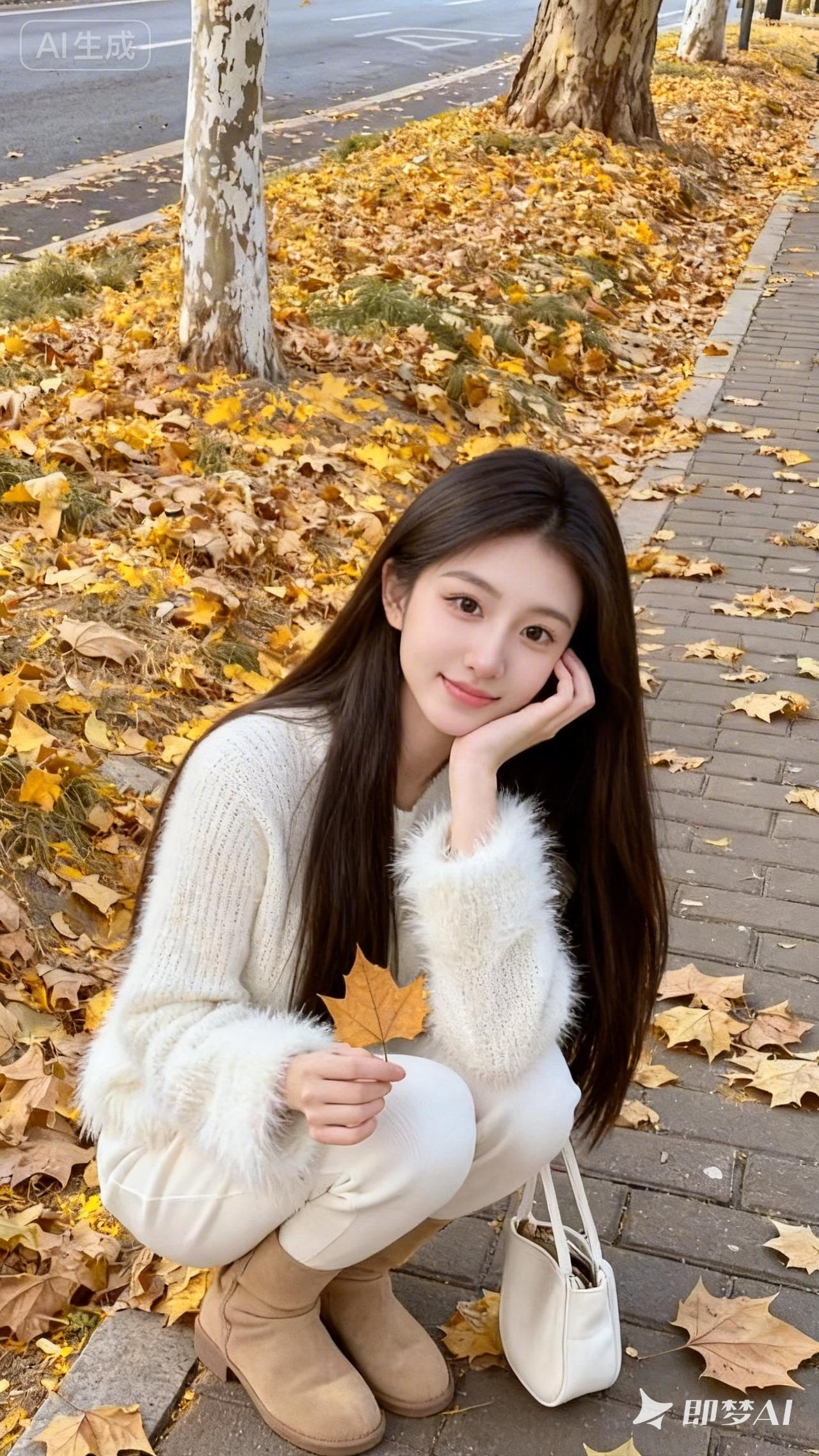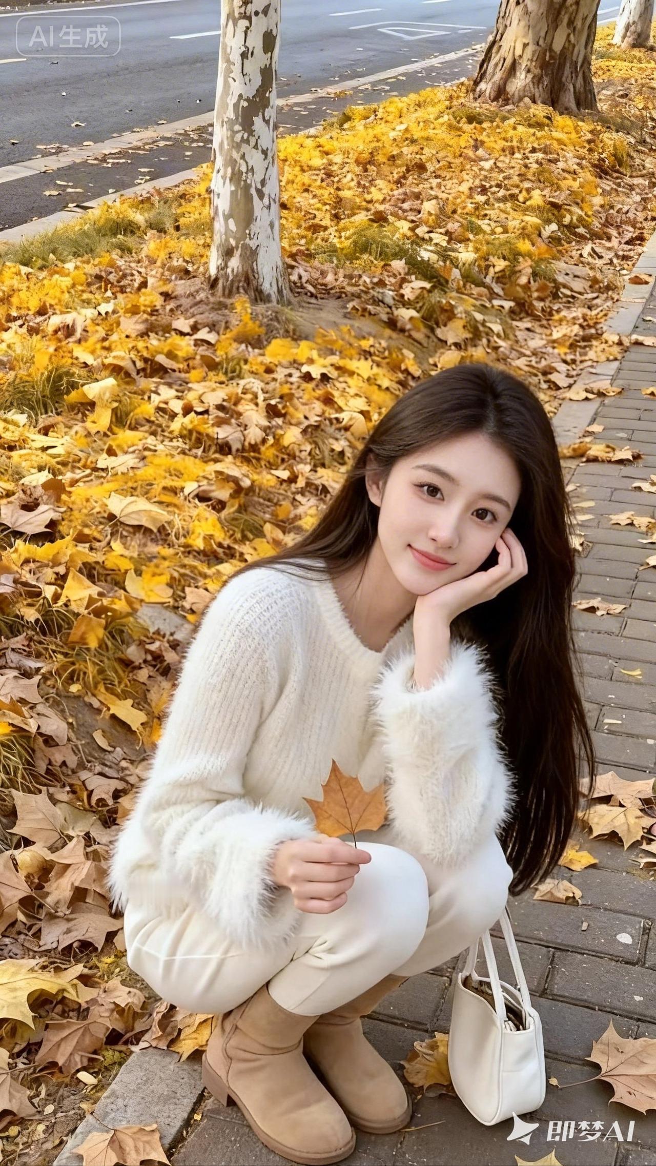一位长发披肩的年轻女性,站在铺满金黄落叶的人行道旁,手托脸颊,皮肤白皙水灵,面带温柔微笑,手持一片枫叶