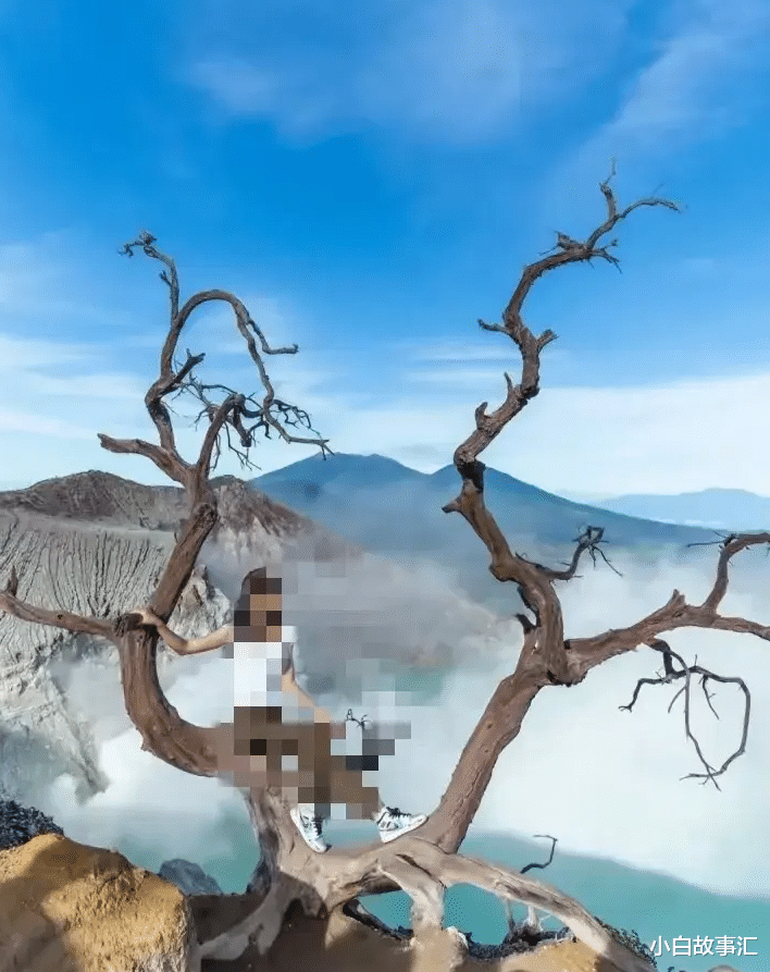 该女子心动不已,想要在靠近火山口的网红树上拍照。