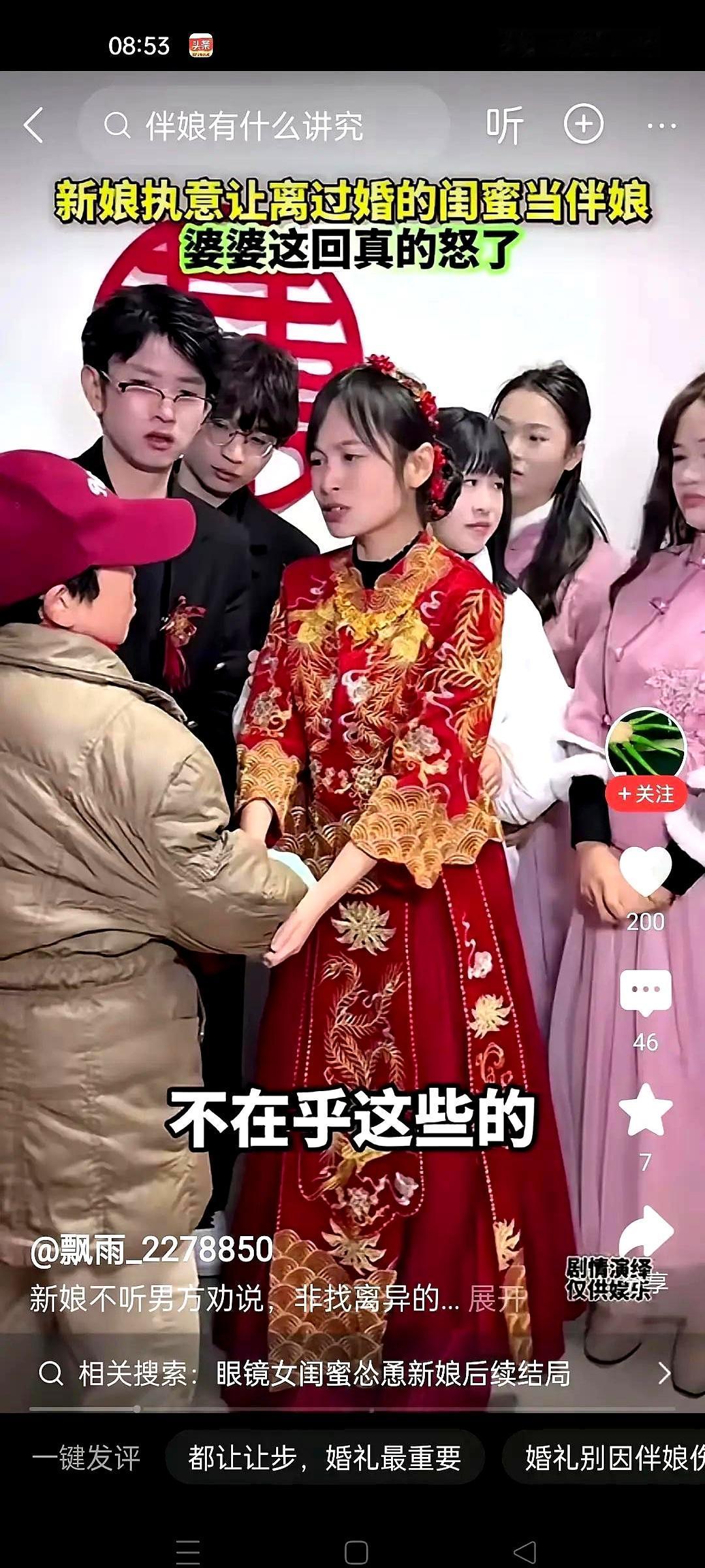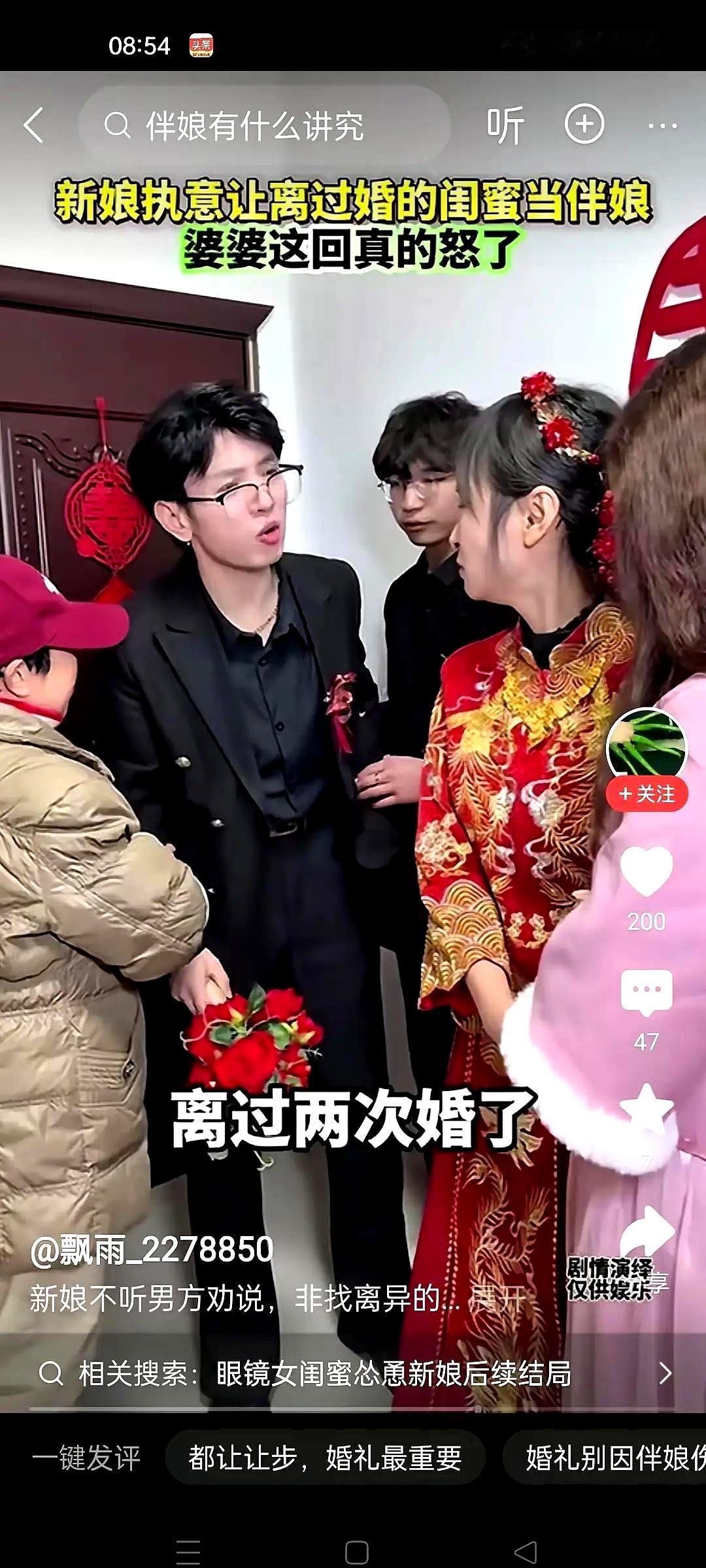 今天看了一场婚礼前夕的闹剧,准新娘坚持让离过两次婚的闺蜜做伴娘,婆婆当场炸锅:离过婚就不能当伴娘,不办你这婚! 新郎竟把手里的花一摔,宣布不结。 戏精不在新人,而在观念的撕裂:长辈把婚俗当底线,年轻人把友情当底色。 更刺眼的是新郎的退位——不调解、不安抚,反而把婚礼当试金石。 婚礼本该是两家人磨合的起点,这种剧本,留给谁当反面教材?