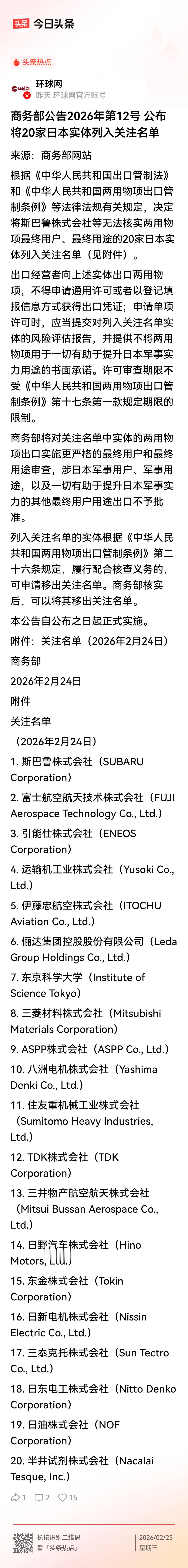开工即开弓,精准打击日本两用企业! 丙午马年开工第一天,商务部连发两道制裁令,即2026年11号令和12号令,对日本20家军民两用企业实施出口管制,对日本20家企业列入出口关注名单! 这就叫做开工即开弓,出手即重手!这个决定,名单精准,比让早市道歉更得劲[给力],极大的提振了中国人民的士气,对此我们坚决支持!!!