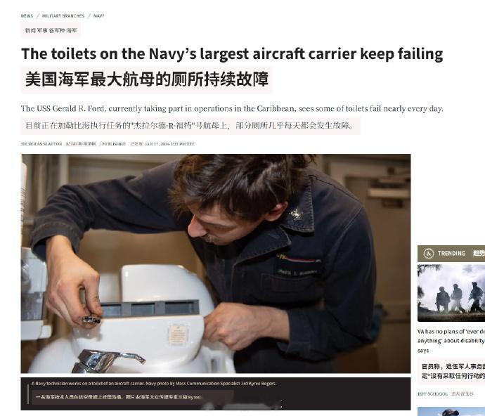 美福特号航母厕所大面积瘫痪 美国海军福特号航母粪涌向前