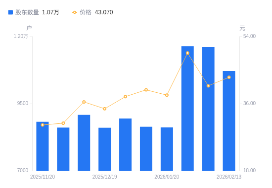 日期A股户数(户)流通A股户均持股数(股)户均持股市值(万元)2026-02-131071310219.5844.022026-02-10116169425.1438.432026-01-30116409405.7146.632026-01-20861512708.3548.652026-01-09864112670.1150.302025-12-31894312242.2546.362025-12-19860512723.1244.052025-12-10908112056.2143.942025-11-28860912717.2039.112025-11-20882612404.5337.56