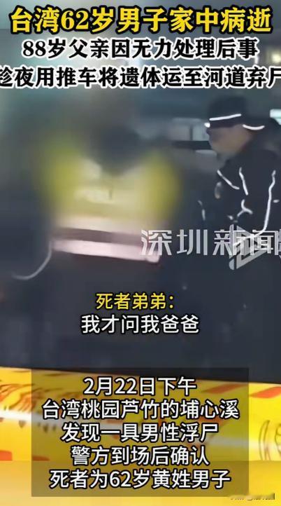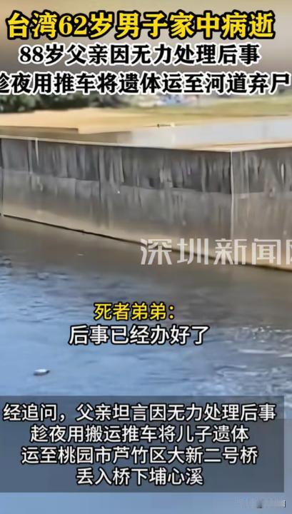“这个父亲够狠!”一62岁男子在家里病逝,88岁父亲竟然大半夜,用推车把他的遗体推到河道扔掉了,小儿子回家,看哥哥不在,问父亲哥哥去哪儿了?父亲撒谎说,他哥哥死掉了,已经火化,后事都办完了。小儿子吓了一跳,怎么那么快? 谁也没有想到,一辆老旧的手推车,会在凌晨两点多悄悄出现在河道边。推车的人,是一位88岁的老人。车上躺着的,是他62岁的儿子。 这起事件发生在江苏某地。62岁的男子因突发疾病在家中去世。家里只有年迈的父亲在身边。 老人守着儿子的遗体整整一天,既没有报警,也没有通知其他子女。邻居后来回忆,那晚隐约听见推车轱辘碾过水泥地的声音,但没人多想。 老人用家里装杂物的平板推车,把已经僵硬的儿子推到不远处的河道边。夜色掩护下,他费力地将遗体拖下车,推入水中。 整个过程,没有人目睹。做完这一切,他独自回到空荡荡的屋子,像什么都没发生一样。 几天后,小儿子从外地赶回家中探望父亲。进门时,他随口问了一句:“哥呢?” 老人语气平静地回答:“他死了,已经火化,后事都办完了。”小儿子当场愣住——“怎么这么快?谁给办的?”老人含糊其辞,只说“简单处理了”。 疑惑在心里生根。兄弟去世这么大的事,竟然没有通知自己?正当小儿子准备追问时,警方在附近河道打捞出一具男性尸体。 经过DNA比对,确认正是这名62岁的男子。消息传来,小儿子才知道,父亲之前说的“火化”,不过是一句谎言。 警方调查后查明,男子确因疾病自然死亡,没有他杀迹象。但老人擅自将遗体弃置河道,涉嫌侮辱尸体罪或相关违法行为。 老人被带走调查时,神情木然。他反复说的一句话是:“我年纪大了,没钱,也没力气办后事。” 邻居说,这个家庭并不富裕。62岁的男子长期身体不好,基本靠父亲和弟弟接济生活。88岁的老人身体也不好,行动迟缓。 有人猜测,老人或许害怕高昂的丧葬费用,也或许一时慌乱失了主意。 事情曝光后,在网络上迅速引发热议。有人愤怒:“再穷也不能把亲生儿子扔河里!” 也有人叹息:“88岁老人守着儿子的遗体,那种绝望恐怕难以想象。”还有法律人士指出,根据《刑法》规定,故意侮辱、毁坏尸体的,可能构成犯罪,应当依法追究责任。 但法律也有“责任能力”的考量。88岁的高龄,身体和精神状况如何,是否具备完全刑事责任能力,都会成为司法机关评估的重要因素。 如果认定情节较轻、社会危害性较小,加之年事已高,可能会依法从轻、减轻甚至免予刑罚,但不代表行为本身没有违法性。 社区干部后来上门探访时,老人坐在木椅上发呆。他说自己那晚一夜未眠,看着儿子躺在床上,心里发慌,“不知道该怎么办”。 他说怕麻烦别人,也怕花钱,想着“人都没了,早点处理算了”。只是他没想到,这样的处理方式,会带来更大的法律后果。 事情曝光后,网友们迅速在各大平台展开热议。有人愤怒地说:“88岁的老父亲,把自己亲生儿子扔河里,这是什么心态?再穷也不该这样!” 评论区里,“侮辱亲情”、“冷血老父”、“法律不能容忍”这样的词刷屏,情绪几乎一边倒地谴责老人。 也有网友从老人的角度出发,表示理解与惋惜:“88岁高龄了,独自守着儿子去世,身体不好又没钱,他心理压力太大了,可能一时慌了手脚。” 有人说,这其实反映了老龄家庭缺乏社会支持,“如果社区或子女能及时介入,也许悲剧可以避免。”