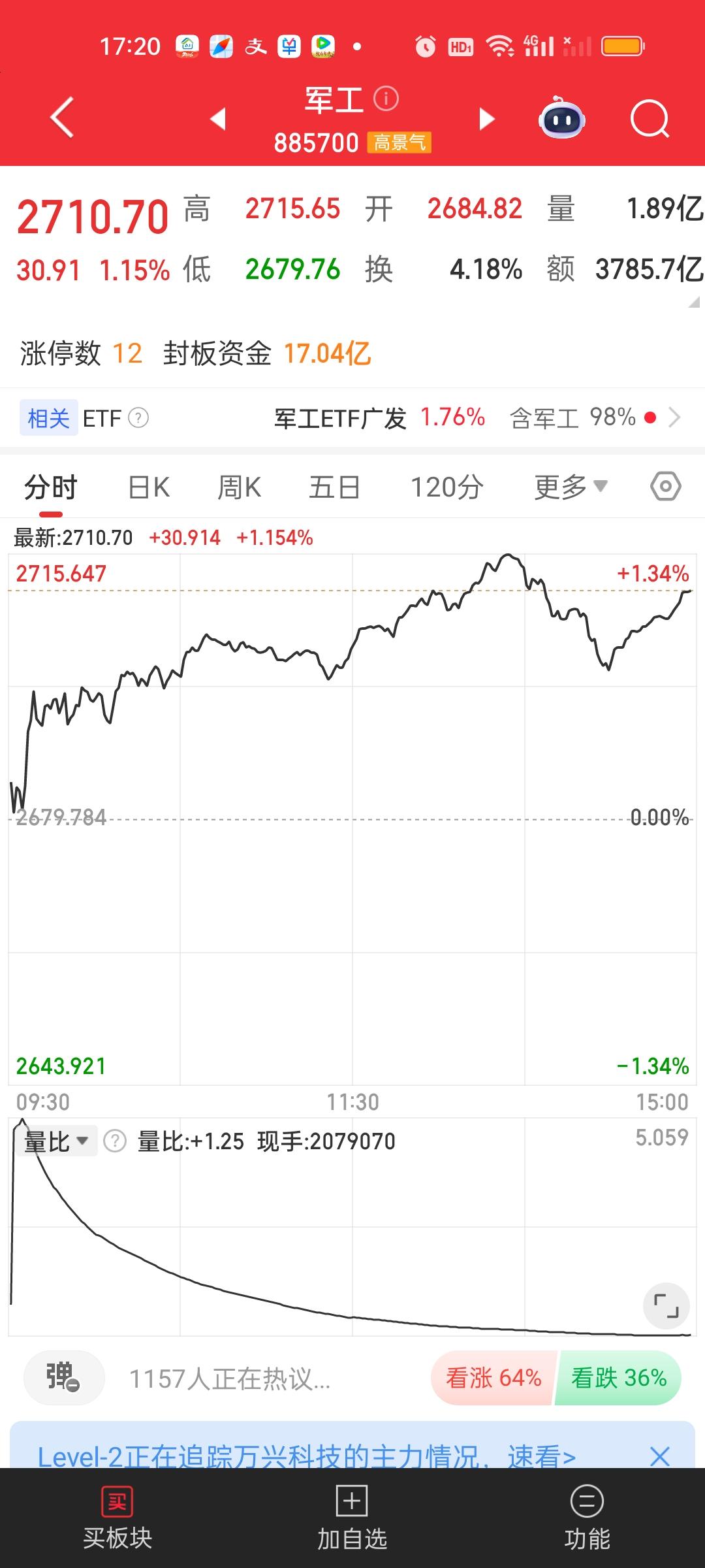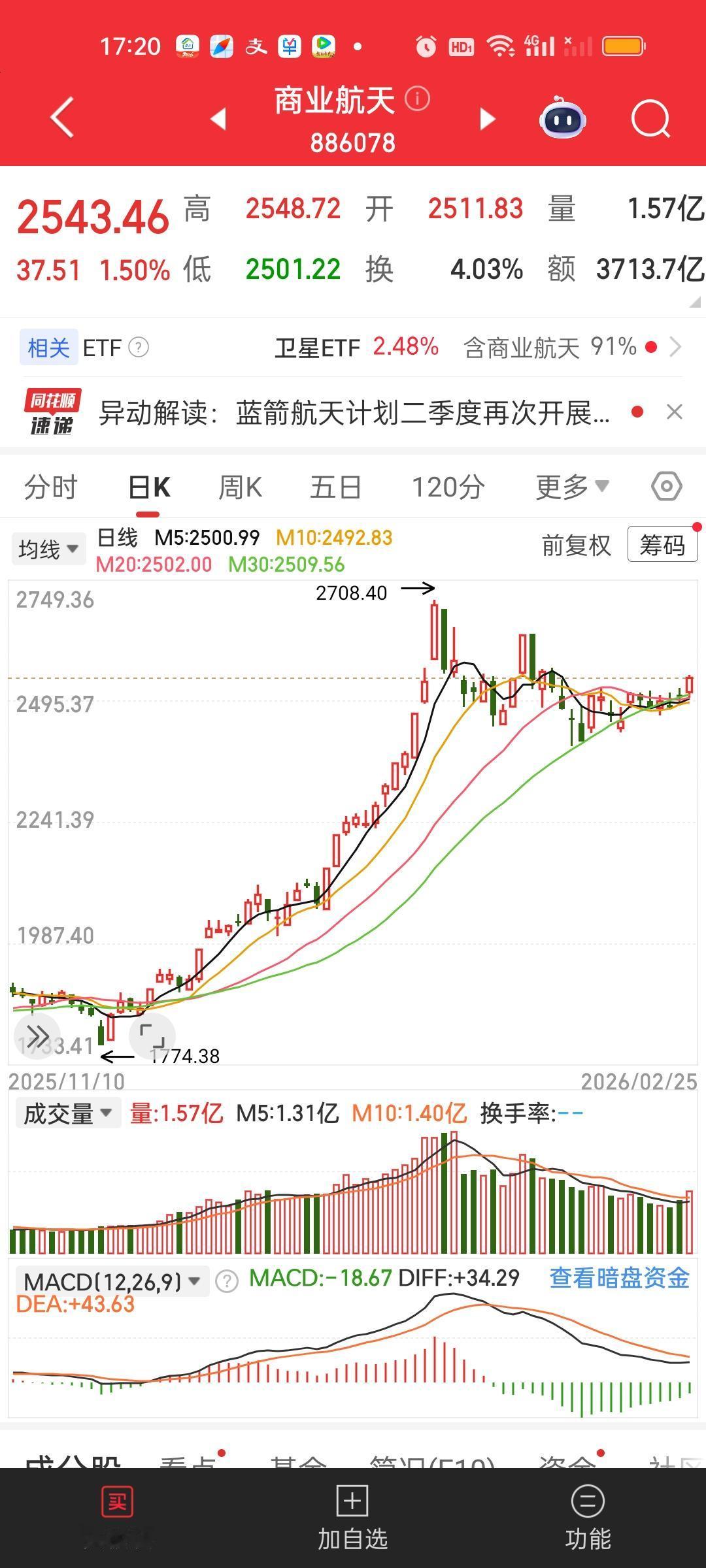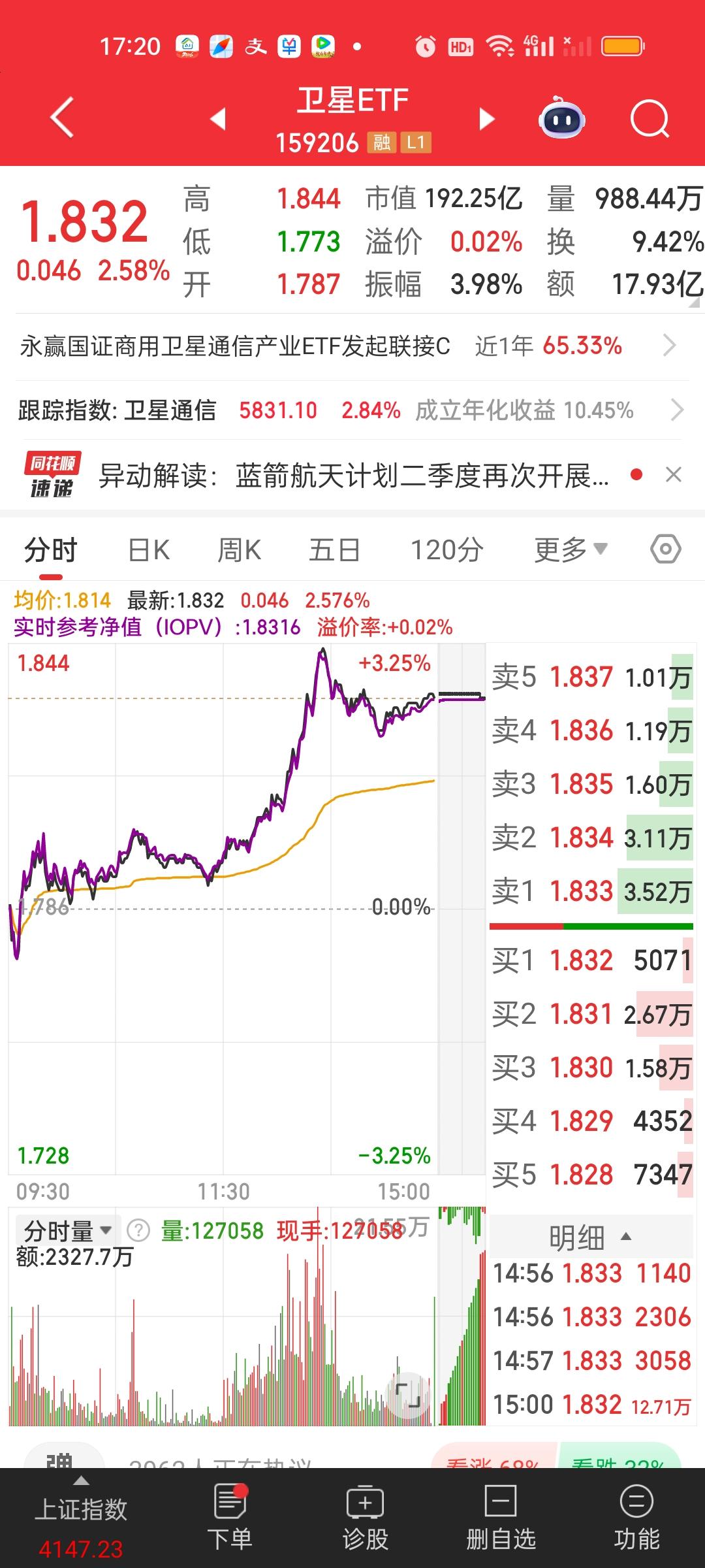 商业航天和军工的走势今天又大体相当,商业航天今天涨了1.50%,军工今天涨了1.15%,场内卫星ETF今天反而涨得最多,收盘涨了2.58%,商业航天和军工今天收盘收在了所有均线上方。而卫星ETF只是站上了5日线,距离站上所有均线还差了95个基点。场内卫星ETF我觉得还是可以拿的。
