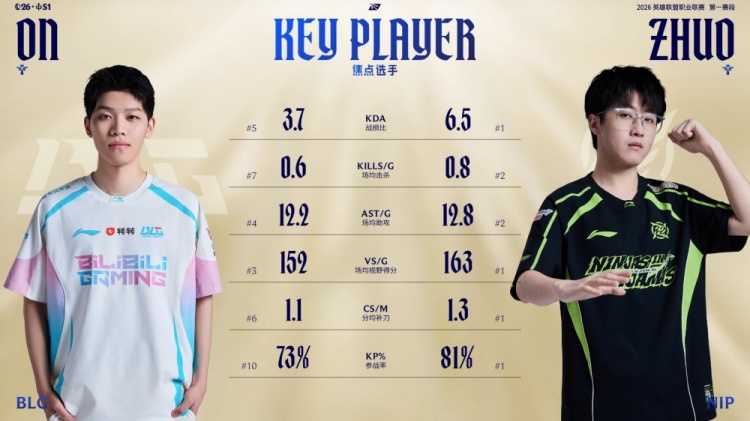 2.图二为两队辅助选手各项数据对比,其中Zhuo各项数据均领先于ON