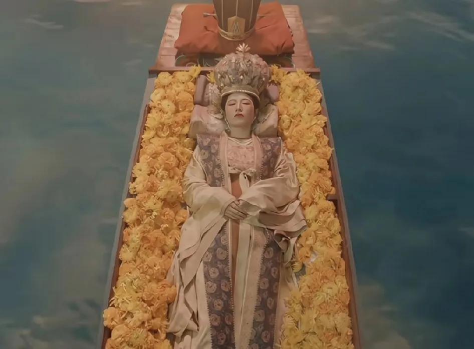 我觉得钱弘俶顾着悲伤,没听清孙太真的临终遗言。 孙太真对:“土葬太闷,会喘不上气儿,还是海葬吧,海水是咸的”。 钱弘俶大概听清了海葬两字,于是帮孙太真一番打扮后如下。 孙太真穿着封妃时的华贵衣服,还有项链,又贵气又美,钱弘俶就这样不舍的看着她往海上漂流了。 但是,这么明显的珠宝外露,不盖个镂空木盖子。 别人看到,应该会打捞起来吧。