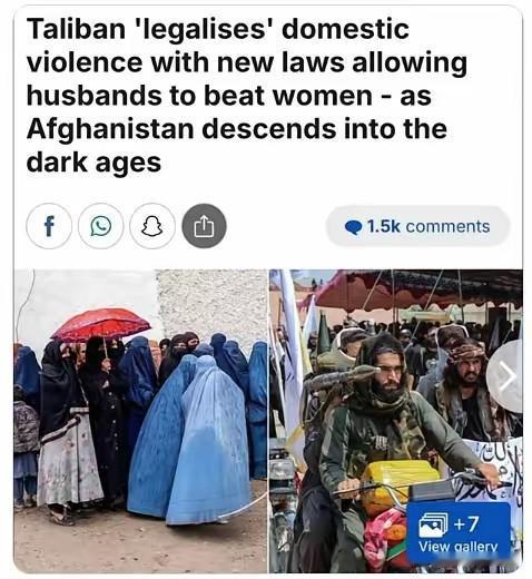 塔利班的政策越来越看不懂了。塔利班通过了一项新的法案,那就是允许在家庭里男方殴打女方和小孩,只要不要造成严重伤害即可,如果造成了严重伤害,那么男方将面临最高 15 天的禁闭,女方应当接受丈夫的教训,不得寻求娘家人的保护,如果女方逃离,将面临更高刑罚的处罚。这就是把家庭暴力合法化,而且是男性暴力合法化,也就意味着女人在家庭的地位越来越低。她们将不会被视为同等的人来对待,对于塔利班的这项法律,世界其他国家怎么没有声援塔利班领导下的妇女呢?虽然这是塔利班的国内事情,但是这严重地损害了妇女儿童的正当权益。