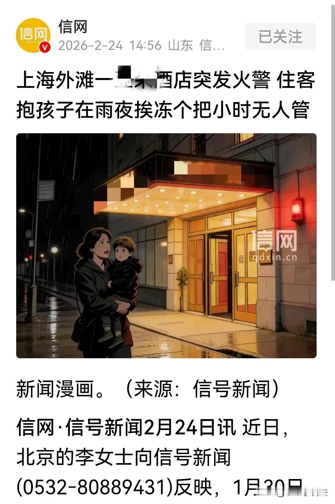 上海,北京女子带年幼的孩子来上海游玩,花1500元入住外滩一家高级酒店。谁知深夜酒店警报骤响,女子吓坏了,顾不得太多,抱起孩子就跑,跑到外面才知正在下雨,孩子连厚衣服都没穿,她抱着孩子及同楼层的房客站在雨中待1个小时,冻的瑟瑟发抖,有的孩子被吓的直哭。直到听旁边大楼保安说警报解除,可以回去。期间酒店无任何作为和关怀,客人问及,酒店轻飘飘解释是“误报”,女子对此很无语,要求酒店给个说法。 1月30日,北京的李女士带着孩子来上海,游玩要尽兴,那住的也要选最好的,起码住的舒服安心。 她选了一家高级酒店,1500元的价格,她不心疼钱,就想要好的环境好的服务,能让自己和孩子享受旅途的舒适。 晚上10点半,李女士和孩子早已洗漱准备休息,酒店房间里突然传来一阵尖锐、刺耳的火警警报声。 声音穿透房门,在安静的楼层里显得格外吓人。 李女士吓坏了,第一反应就是出事了,她来不及多想,一把抱起还穿着单薄秋衣的孩子,抓起随身物品就冲出了房门。 走廊里已乱作一团,隔壁房间、同楼层的房客全都慌慌张张地跑了出来,大家脸上写满了紧张和不安。 所有人都只能凭着本能往消防楼梯涌去,一步一步往下撤离。 可让李女士无比失望的是,从房间门口到楼梯口,再到整栋楼的撤离路线,自始至终没有出现一名酒店工作人员。 没人指引方向,没人提醒注意安全,更没人告诉他们到底发生了什么。 慌乱之中,老人喘着粗气扶着栏杆往下挪,小孩子被刺耳的警报和拥挤的人群吓得哇哇大哭,场面既混乱又让人心疼。 李女士紧紧护着怀里的孩子,心里又怕又急,她不明白,一家定位中高端的连锁酒店,在突发火警警报时,居然连最基本的疏散引导都做不到。 更糟糕的是,她们跑到外面后,发现外面正下着冷雨,温度近0℃,大部分客人都是仓促逃生,根本来不及穿上厚外套,只能穿着睡衣、秋衣站在寒风里发抖。 李女士看着孩子冻得小脸发白,心里又心疼又愤怒。 她和其他客人在雨里足足等了近一个小时,酒店没有任何人送来一把伞、一杯热水,连一句安抚的话都没有。她多次拨打酒店电话,也始终无人接听。 直到11点半,客人们才从旁边大楼的保安口中得知,警报已经解除,可以返回房间。 而此时回到酒店,前台只有一名普通员工在岗,店长、经理全都不见踪影。 面对大家的质问,工作人员只是轻描淡写地说了一句“是误报”,便再无其他解释。 事后李女士才知道,这场警报根本不是设备故障,而是有客人在楼道里吸烟,不小心触发了烟感报警器。 可即便如此,酒店的应急处置依然让人无法接受:警报响起无人疏导,客人淋雨受冻无人照料,安全隐患出现也没提前管控。 从惊魂夜结束到退房离开,酒店方就像什么都没发生过一样,没有道歉,没有说明,更没有任何补偿方案。 李女士越想越生气,近1500元的房价,买来的不是安心与舒适,而是一场带着孩子在寒夜里担惊受怕的糟糕体验。 她忍不住提出一连串疑问:火警为何会被轻易触发?紧急时刻为何没有工作人员引导?客人在雨中受冻,为何连基本的物资和安抚都没有? 面对媒体的追问,酒店接线人员先是确认了吸烟触发警报的事实。 可当问及服务失职和后续补偿时,一位自称负责人的工作人员却以“当天不是自己值班”为由,拒绝透露更多细节。 只含糊表示会针对疏散不到位、缺乏安抚等问题进行整改,至于如何整改、是否赔偿,始终没有给出明确答复。 《民法典》第1198条规定:宾馆……娱乐场所等经营场所、公共场所的经营者、管理者或者群众性活动的组织者,未尽到安全保障义务,造成他人损害的,应当承担侵权责任。 对此,专业律师也给出了明确说法:酒店作为经营场所,有义务保障消费者的人身安全。 在此次事件中,酒店明显没有履行应急疏导、现场安置等安全保障义务,已侵犯了消费者的合法权益。 李女士在内的所有住客,完全有权要求酒店退还住宿费,并对因此造成的损失依法索赔。 一场本可避免的警报,一次完全失职的应急处置,让一次温馨的出行变成了难忘的噩梦。 近千元的房费,买不来安全,也买不来服务,更买不来最基本的责任心。 对于出门在外的旅客来说,比起豪华的装修和便利的位置,真正让人安心的,永远是危急时刻有人管、出事之后有人担的踏实感。 而这一点,正是这家酒店最缺失的东西。 对此您觉得酒店应对此负责吗?