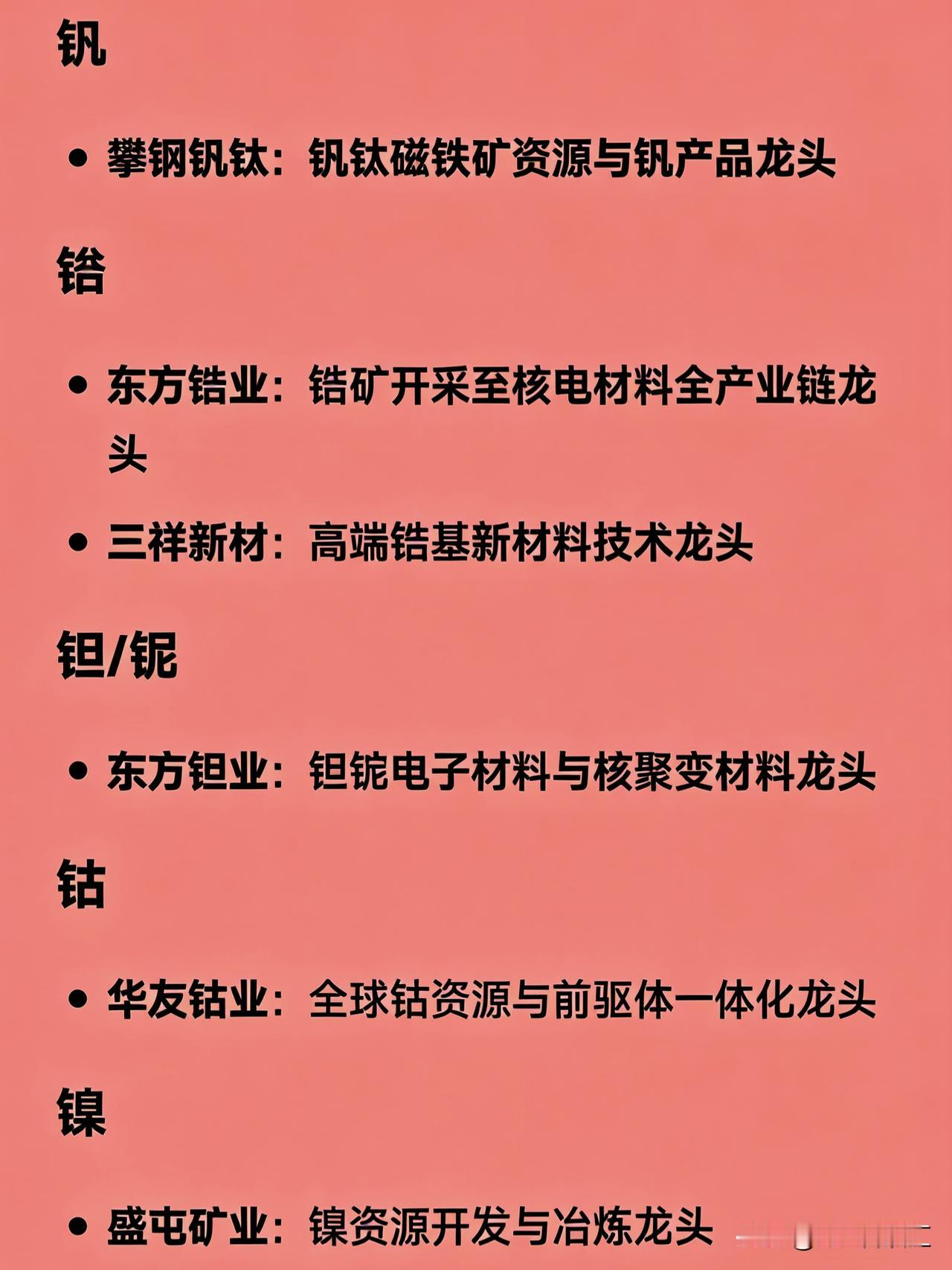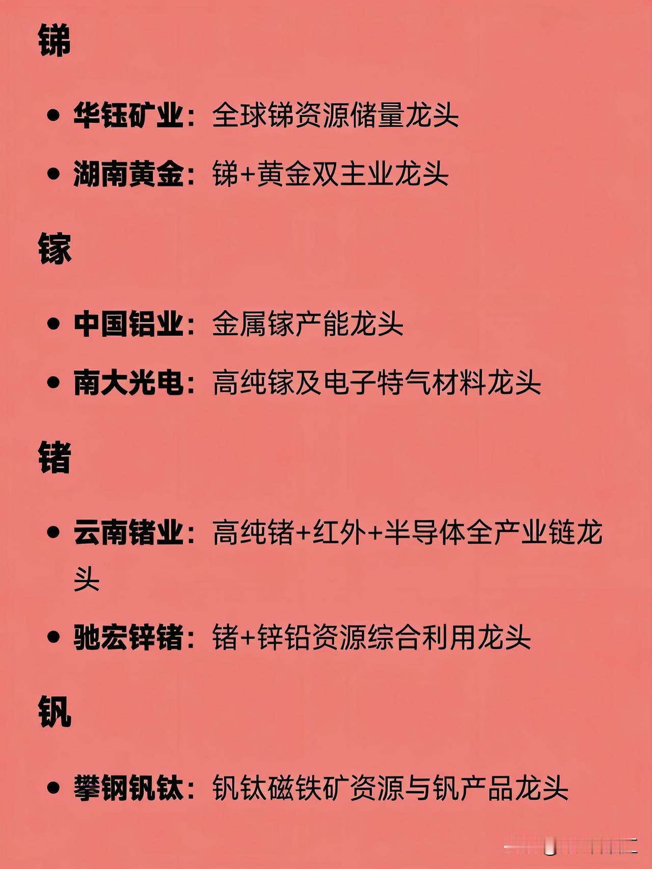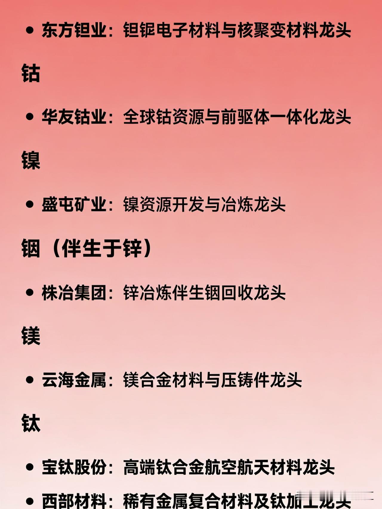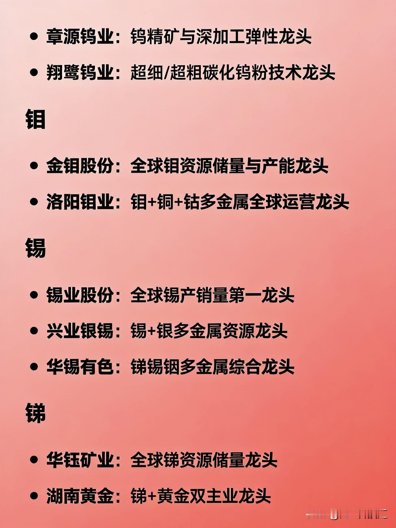 小金属概念相关龙头企业全汇总 稀土 北方稀土:全球轻稀土龙头 中国稀土:稀土冶炼分离龙头 广晟有色:中重稀土+稀土材料一体化龙头 盛和资源:海外稀土资源布局龙头 钨 中钨高新:硬质合金与钨全产业链龙头 厦门钨业:钨+稀土+锂电综合材料龙头 章源钨业:钨精矿与深加工弹性龙头 翔鹭钨业:超细/超粗碳化钨粉技术龙头 钼 金钼股份:全球钼资源储量与产能龙头 洛阳钼业:钼+铜+钴多金属全球运营龙头 锡 锡业股份:全球锡产销量第一龙头 兴业银锡:锡+银多金属资源龙头 华锡有色:锑锡铟多金属综合龙头 锑 华钰矿业:全球锑资源储量龙头 湖南黄金:锑+黄金双主业龙头 镓 中国铝业:金属镓产能龙头 南大光电:高纯镓及电子特气材料龙头 锗 云南锗业:高纯锗+红外+半导体全产业链龙头 驰宏锌锗:锗+锌铅资源综合利用龙头 钒 攀钢钒钛:钒钛磁铁矿资源与钒产品龙头 锆 东方锆业:锆矿开采至核电材料全产业链龙头 三祥新材:高端锆基新材料技术龙头 钽/铌 东方钽业:钽铌电子材料与核聚变材料龙头 钴 华友钴业:全球钴资源与前驱体一体化龙头 镍 盛屯矿业:镍资源开发与冶炼龙头 铟(伴生于锌) 株冶集团:锌冶炼伴生铟回收龙头 镁 云海金属:镁合金材料与压铸件龙头 钛 宝钛股份:高端钛合金航空航天材料龙头 西部材料:稀有金属复合材料及钛加工龙头