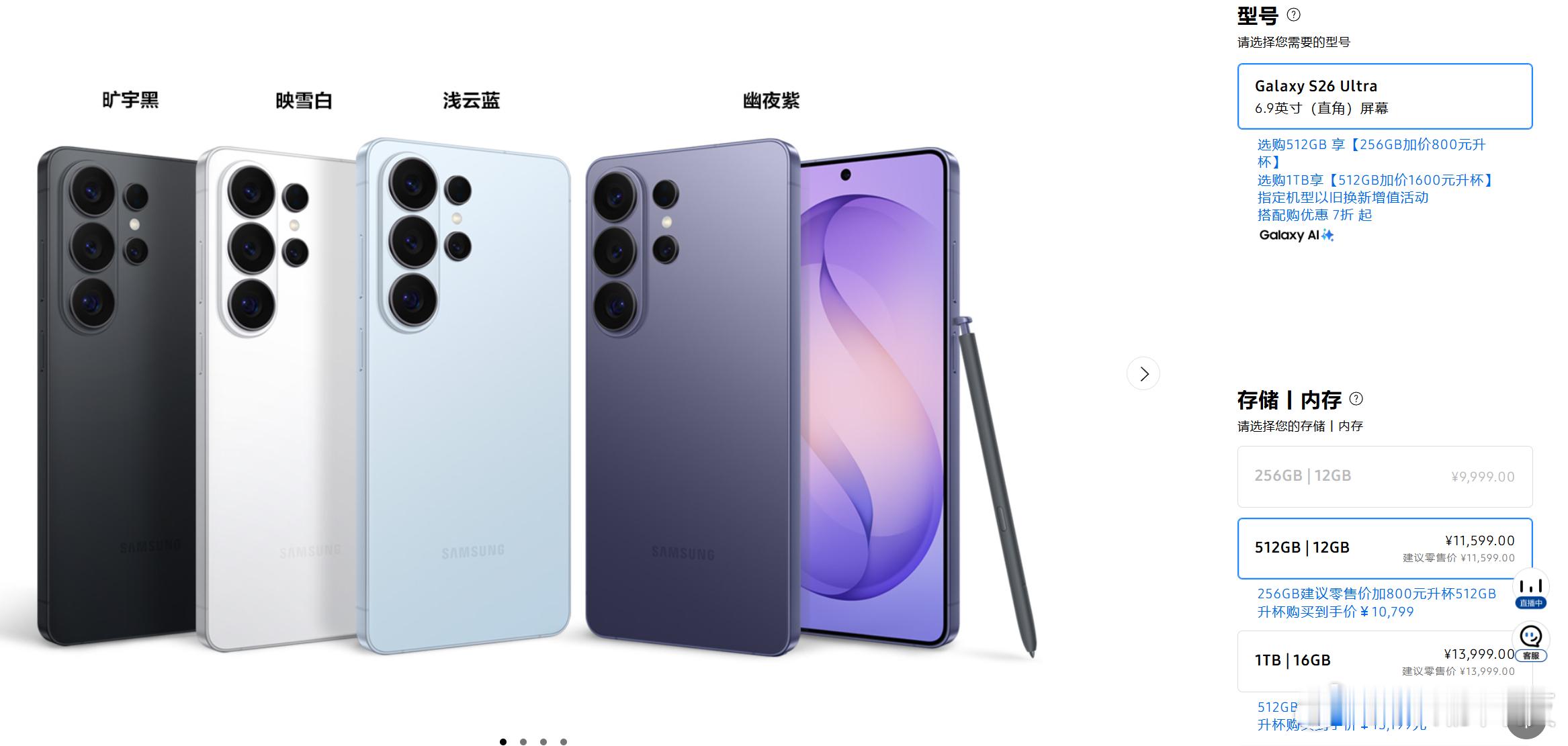 三星Galaxy S26 Ultra:-12+256GB,9999-12+512GB,11599(10799)-16+1TB,13999(13199)