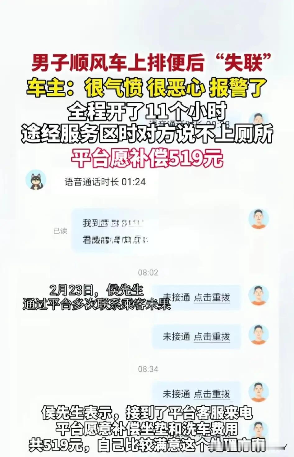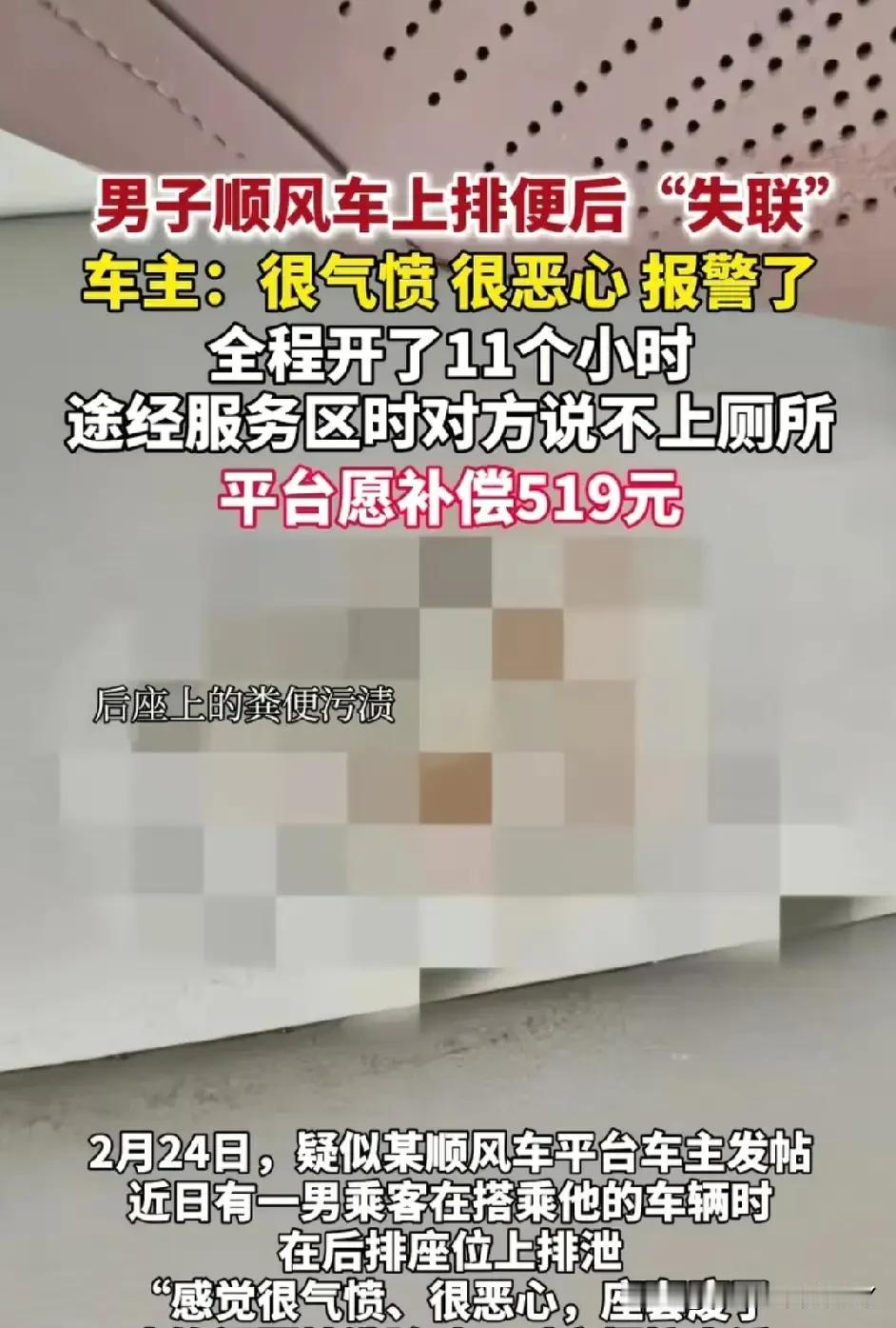 “真是林子大了啥鸟都有!”江苏一车主跑春节顺风车11小时,乘客全程没说不舒服,到地方乘客下车后,竟发现排泄物。 江苏侯先生这趟顺风车,跑得窝囊透顶。大过年的,从徐州邳州接单去苏州吴中,11个小时堵在高速上,眼皮都熬红了。 服务区停车时,他特意问后排乘客要不要方便,对方头也没抬说“不用”。谁能想到,车到目的地,乘客推门就走,他一拉后排车门——胃里当场翻江倒海。 座位上赫然一堆排泄物,臭气顺着门缝往外涌,呛得人直捂鼻子。好好的座套算是废了,内饰缝里沾着污渍,整辆车像个移动的垃圾桶,别说接单,自己坐进去都得憋气。 侯先生捏着鼻子联系乘客,电话不接,平台消息不回,活脱脱人间蒸发。报警后,对方连面都不露,调解?想都别想。最后还是平台出面,赔了519块清洗费和新坐垫钱,才算让他顺了口气。 网友看得直骂:这哪是急着赶路?分明是缺德没底线!高速堵得再久,服务区总有厕所;实在憋不住,跟司机说句实话,谁能不让你下车?偏要偷偷摸摸弄脏别人的车,跑了还装没事人,这素质,连三岁孩子都不如。 侯先生跑车图个啥?无非是春节挣点辛苦钱,顺便帮人搭个便车。11个小时里,他没催过一句,没多要一分,换来的却是这种糟心事。座套能换,清洗费能赔,可那股子恶心劲儿,怕是好多天过不去。 老话说“与人方便,自己方便”。坐别人的车,惜着点用是本分。你图一时省事,把麻烦甩给别人,良心过得去吗?就像有人借了邻居的锅,用脏了不洗还往里头倒垃圾,这不是缺心眼,是压根没把别人放眼里。 平台的处理算公道,可终究堵不住某些人的歪心思。真要遇上这种事,司机除了自认倒霉,似乎没更好的招。或许该给顺风车加条规矩:车里装个监控?可那样一来,谁还敢安心坐车? 说到底,这事考的不是规则,是人心。一个人要是连基本的体面都不顾,走到哪儿都让人膈应。侯先生的车能洗干净,可某些人心里的脏,怕是这辈子都洗不净了。 出门在外,多点体谅,少点自私。你对别人的东西上心,别人才愿意给你方便。不然啊,路走窄了,迟早得栽跟头。 消息来源:@纵览新闻