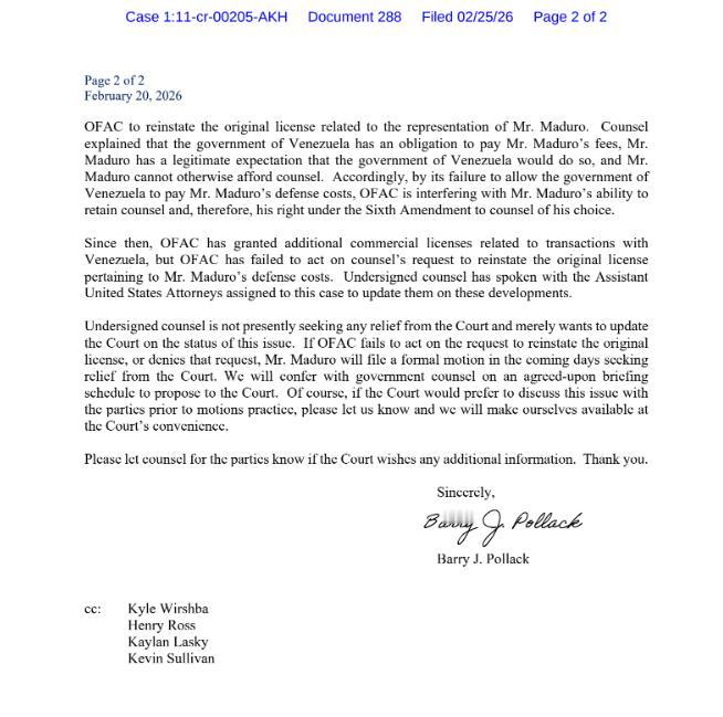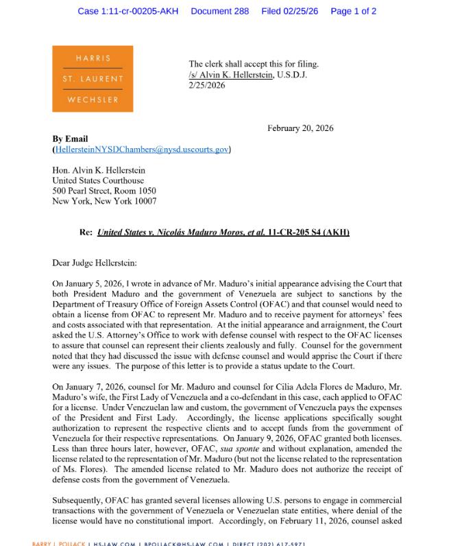 马杜罗似乎对自己逃出美国法律的制裁仍抱有幻想,他聘请强大的律师团队想做最后一搏。但是他现在遇到了大问题,他没钱了!马杜罗现在竟然穷的没钱支付在美国的律师费,现如今他只能委托律师团队向法官提出要求美国政府允许他使用委内瑞拉国家资金来支付律师费用。 美媒说马杜罗已耗尽在美国的辩护资金,美国政府一方面标榜 “被告有权获得律师帮助”,另一方面用制裁与行政手段剥夺这一权利。这就是美式民主标准,明里一套,背后一套! 近日马杜罗的法律团队已请求纽约的一名联邦法官强制美国外国资产控制办公室释放委内瑞拉国家资金,理由是他无力支付诉讼费用。 他的律师波拉克致信审理案件的法官赫勒斯坦,核心诉求是马杜罗个人已无财力支付辩护费,只有委内瑞拉政府能承担。按委法律与惯例,国家有义务为总统支付履职相关法律费用。还有美国对马杜罗的经济冻结与后面的撤销许可,侵犯马杜罗依据美国宪法第六修正案享有的 “获得律师帮助权” 与 “选择律师的权利”。最后请求法官强制恢复许可动用委内瑞拉国家资金用于支付律师费,否则马杜罗将被迫依赖公设辩护人,无法获得有效辩护。 波拉克团队是全美顶尖刑事辩护团队,之前曾经代理过阿桑奇等大案,他的小时费可以达到数千美元、全程费用数百万美元,马杜罗个人完全无力承担。 美国对委制裁已超 10 年,冻结委政府、央行、石油公司在美国及全球的数百亿美元资产,马杜罗个人资产也被全面冻结,无任何可自由支配的美元资金。 1 月 9 日,美国财政部外国资产控制办公室曾短暂发放特别许可,允许委内瑞拉政府动用被冻结的国家资金支付马杜罗夫妇的律师费。结果不到 3 小时,它又单方面撤销该许可、未作解释,仅保留对马杜罗妻子的部分许可,彻底切断马杜罗的辩护资金来源。 美国财政部外国资产控制办公室此前先是批准马杜罗可以使用冻结的资金而后很快又反悔撤回,本质是用美国政府担心马杜罗利用资金把事情扩大化,其实就是美国动用金融手段剥夺马杜罗的辩护权。表面是公平公正审理马杜罗案件,实际又担心出问题,通过资金封锁来削弱其辩护能力,进而达到控制事态发展的目的。 马杜罗的律师团队指责美国财政部外国资产控制办公室阻挠司法程序,拒绝委内瑞拉政府动用其公共资金,这对马杜罗不公平! 律师们指出,美国政府近期向委内瑞拉发放了新的贸易许可证,却对马杜罗总统提起的诉讼置之不理。面对这种财务困境,马杜罗的律师团队向司法系统发出最后通牒。“如果外国资产控制办公室不采取行动恢复原许可证,或者拒绝该请求,马杜罗先生将在未来几天内向法院提交正式动议,寻求救济,”信中警告说。 目前审理马杜罗案件的赫勒斯坦法官只是下令将该文件归档到案件档案中,而马杜罗目前也只能等待美国当局允许他动用共和国的资金,以在美国司法面前保全自己。 根据美国类似的案件经验来看的话,赫勒斯坦法官大概率会要求财政部外国资产控制办公室作出解释,但最终决定权仍在美国政府,司法权力很难真正强制解冻马杜罗的资金。 特朗普政府大概率坚持冻结,以最大化施压马杜罗同时规避自身风险,特朗普也知道自己下令的违法抓捕行动本来国内就有反对意见,如果让马杜罗把抓捕事件发酵复杂化,那到时候也不好收场。而委内瑞拉政府则会老生常谈的在外交上做做样子,无非就是强烈谴责美国 “剥夺辩护权、政治迫害”一类的说辞。 马杜罗的资金问题一旦解决不了,那么他很大可能被迫申请公设辩护人,那么对于他来说将是灾难性的,这样的审判可能就是走个流程就会被判刑。或者也有可能他现有的律师团队以 “无法获得有效辩护” 为由申请延期、驳回起诉,进一步拖延庭审。但无论如何,他现在面临极大的困难,想逃脱美国政府的魔爪,难于登天!