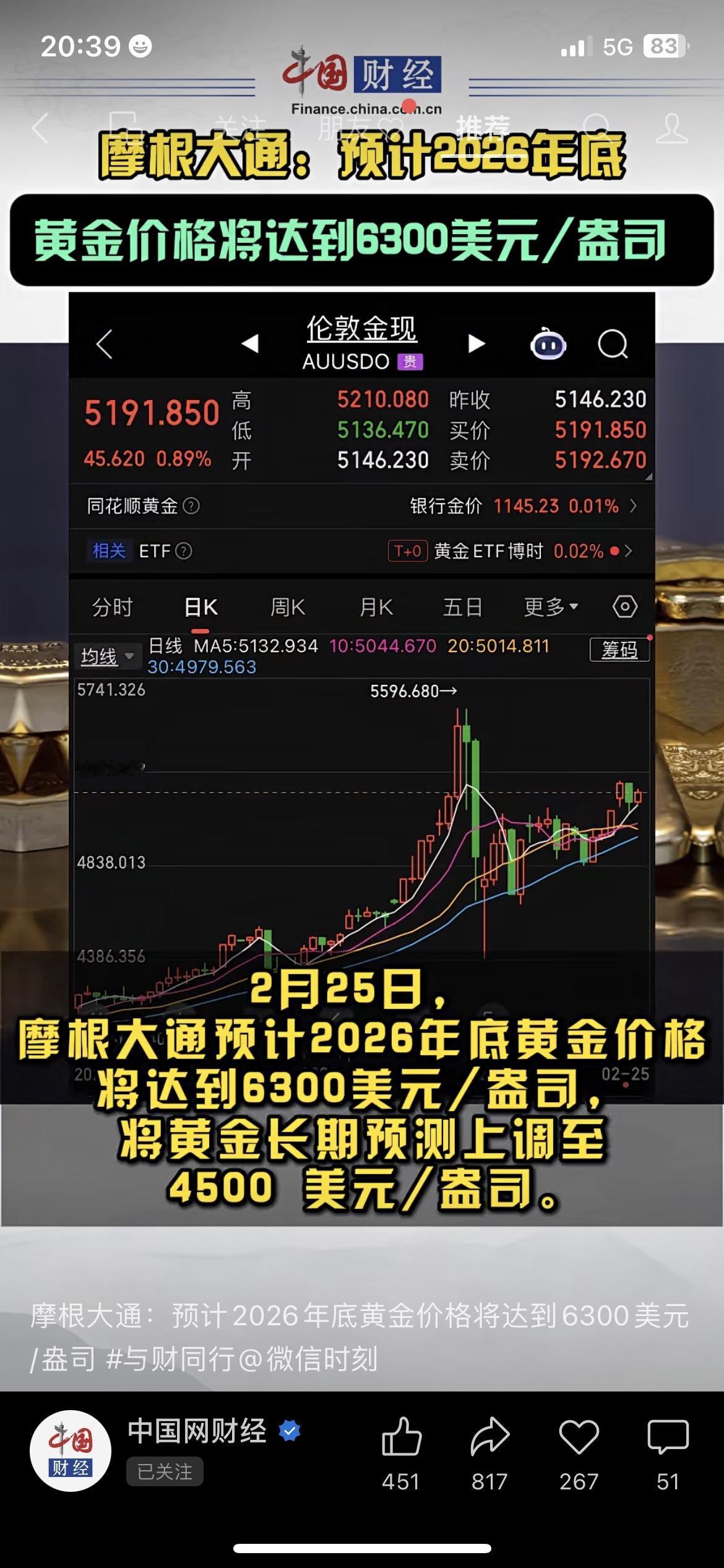 摩根大通预测,2026年底黄金价格将达到6300美元/盎司,目前现货黄金报5191美元/盎司,还有超20%的上涨空间。我妈看到这个消息,直接给我发微信,说“要不要再买点黄金首饰”。其实,黄金涨价,既有避险情绪的推动,也有全球经济不确定性的影响。说白了,黄金是避险资产,但也不是稳赚不赔的。咱普通人配置黄金,别盲目追高,适合自己的比例才是最好的。市场有风险,投资需谨慎,不构成任何投资建议。你家里有黄金投资吗?会因为这次预测加仓吗? 黄金价格 避险资产 投资指南黄金行情价格