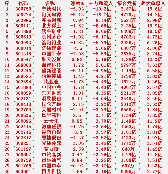 2月26日上午盘,主力趁低位,大幅买入的30名单 胜宏科技:涨幅 +8.51%,净流入 14.8亿元 沪电股份:涨幅 +10.00%(涨停),净流入 13.1亿元 亨通光电:涨幅 +10.00%(涨停),净流入 9.71亿元 华胜天成:涨幅 +10.00%(涨停),净流入 7.03亿元 聚飞光电:涨幅 +20.00%(涨停),净流入 6.78亿元 2月26日中午收盘,主力资金“大幅卖出”的30名单: 宁德时代:跌幅 -5.03%,净流出 19.2亿元 阳光电源:跌幅 -5.13%,净流出 16.7亿元 兆易创新:跌幅 -0.94%,净流出 8.74亿元 北方稀土:跌幅 -1.52%,净流出 8.66亿元 紫金矿业:跌幅 -1.21%,净流出 8.06亿元