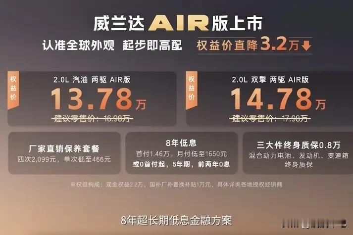 SUV,真的可以看看威兰达 AIR,现在权益价直接给到13.78 万,合资 SUV 里性价比直接拉满。 外观大气耐看,空间够大,日常通勤、周末带家人出门都很合适。标配大屏、电动天窗、LED 大灯这些实用配置,不用再额外加装,省心又有面子。 丰田的品质和油耗大家都懂,平顺省油、开着放心,保养维护也不贵,家用特别实在。这次价格一步到位,优惠力度很大,首付和月供压力都小。 不想花大价钱,又想要合资品牌、大空间、低油耗的 SUV,威兰达 AIR 13.78 万这个价位,闭眼冲都不亏。