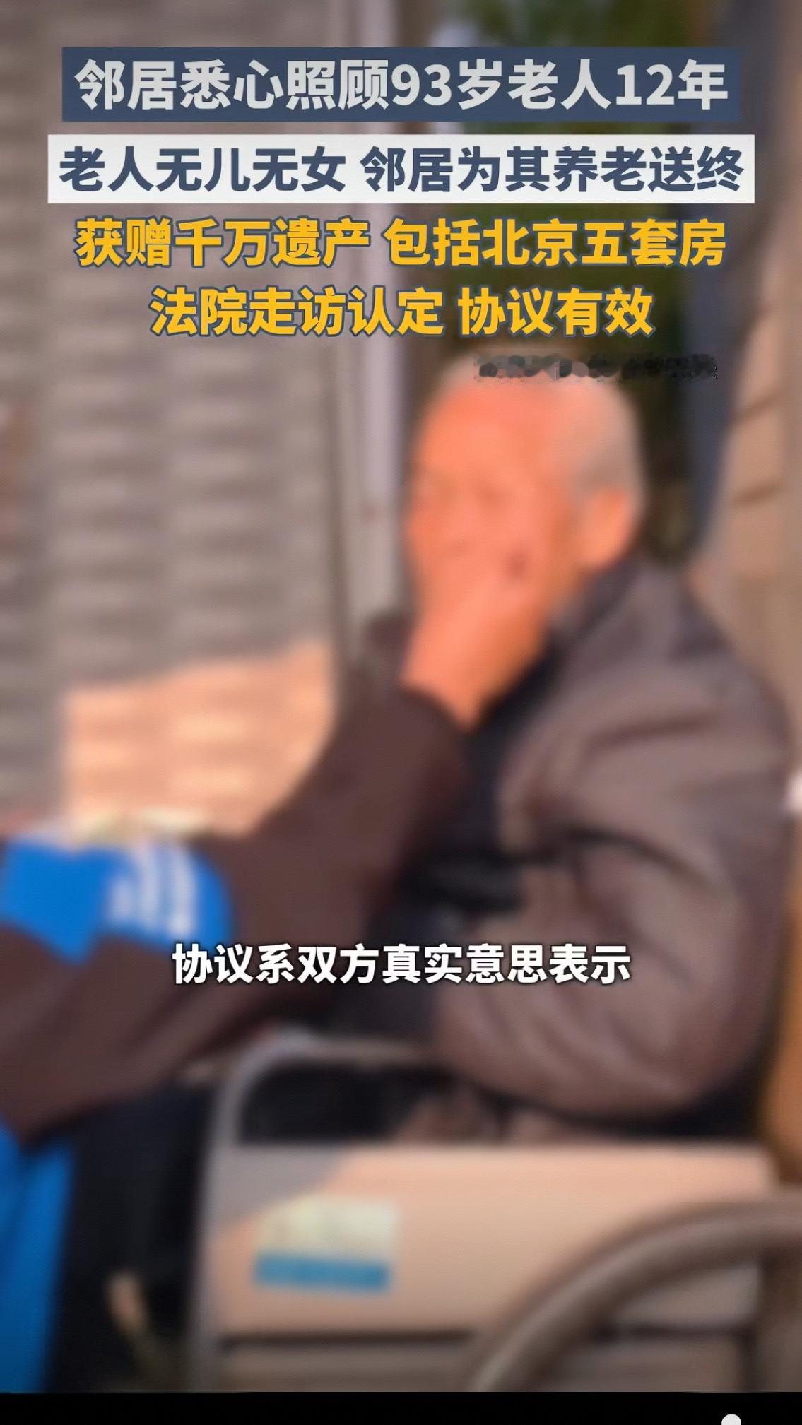 很多人第一反应:天上掉馅饼?凭什么邻居拿千万遗产、五套北京房? 别急着酸,真相比你想的更扎心、更暖心。 93岁老人无儿无女,晚年孤苦伶仃,亲人常年不闻不问。是邻居刘某,一照顾就是12年。四千多个日夜,端茶送水、看病拿药、洗衣做饭、逢年过节陪伴,比亲儿女还上心。老人从行动不便到安详离世,全靠这户邻居托底。 两人早有遗赠扶养协议,村委会见证、律师确认,白纸黑字:你为我养老送终,我把全部家产留给你。后来拆迁,五套房、千万资产,老人依旧认准这位“不是亲人胜似亲人”的邻居。 老人走后,部分亲属跳出来争产,闹上法庭。法院没和稀泥,实地走访、邻里作证、核查协议,一句话定音:协议有效,遗产归照顾者! 这世上最公平的,从不是血缘,而是真心换真心。 多少亲人,住着近、心很远;多少邻居,没血缘、情更深。 有人说邻居运气好,可12年的坚守,不是谁都能做到。病床前无孝子,更何况是毫无血缘的邻居? 这判决,判的是财产,更是世道人心: 法律不亏老实人,善意终有大回报。 远亲不如近邻,不是老话,是人间真相。 你觉得,这千万遗产,邻居拿得该不该? 评论区告诉我,你站谁?独居老人遗产 北京遗产案