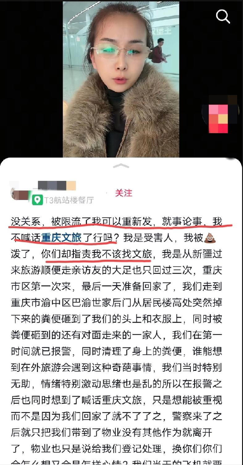 近日,重庆,一新疆女游客发视频称:在小巷子里面走,被高空扔下的屎粑粑砸中了,搞的衣服上身上全都是…… 这位女游客喊话重庆文旅:重庆文旅,你们就这样搞旅游的啊?你们小巷子都不管一下的吗?报警问我们有什么诉求,我们能有什么诉求? 视频发布到网上,网友一边倒的站队“重庆文旅”:怎么现在什么事情都要找到文旅部门头上,这跟文旅部门有半毛钱关系吗? 之后,这位女游客再发视频,表示不再喊话“重庆文旅”了,可好像还是有点心不甘情不愿! 最新消息是:扔屎粑粑的违法嫌疑人已经被找到,也对他进行了相应的处理。这下这位女游客应该可以出一口气了吧? 评论区诸位看官,你们怎么看这个事情?