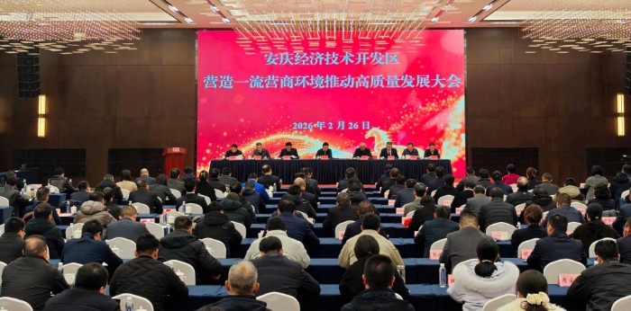 大皖新闻讯2月26日,安庆经开区召开营造一流营商环境推动高质量发展大会,总结2025年发展成果,部署2026年重点工作,动员全区上下以“开局即决战、起步即冲刺”的昂扬姿态,奋力谱写高质量发展崭新篇章。会议对2025年安庆经开区制造业20强、高新技术企业10强、现代服务业10强、高质量发展纳税先锋企业以及优化营商环境先进集体和先进个人等予以表扬,环新集团等4家单位作交流发言。