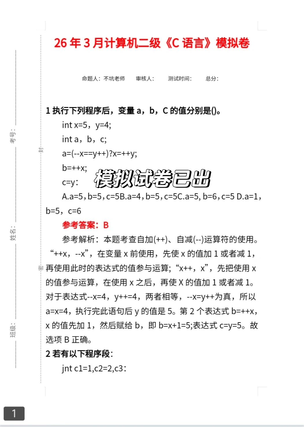 二级C语言备考党狂喜🔥 整理了26年3月全套备考包,从题库到试卷、考点、考纲全覆盖,可打印,还能远程协助安装,小白闭眼冲💯 ✅ 电脑操作题库(26年3月适配) ✅ 电子版试卷及答案 ✅ 基础知识理论电子版(可打印) ✅ 最新考试大纲(26年3月) ✅ 选择题考点电子版(可打印) ✅ 远程协助安装,小白也能直接用 ✅ Win系统适配,省心不踩坑