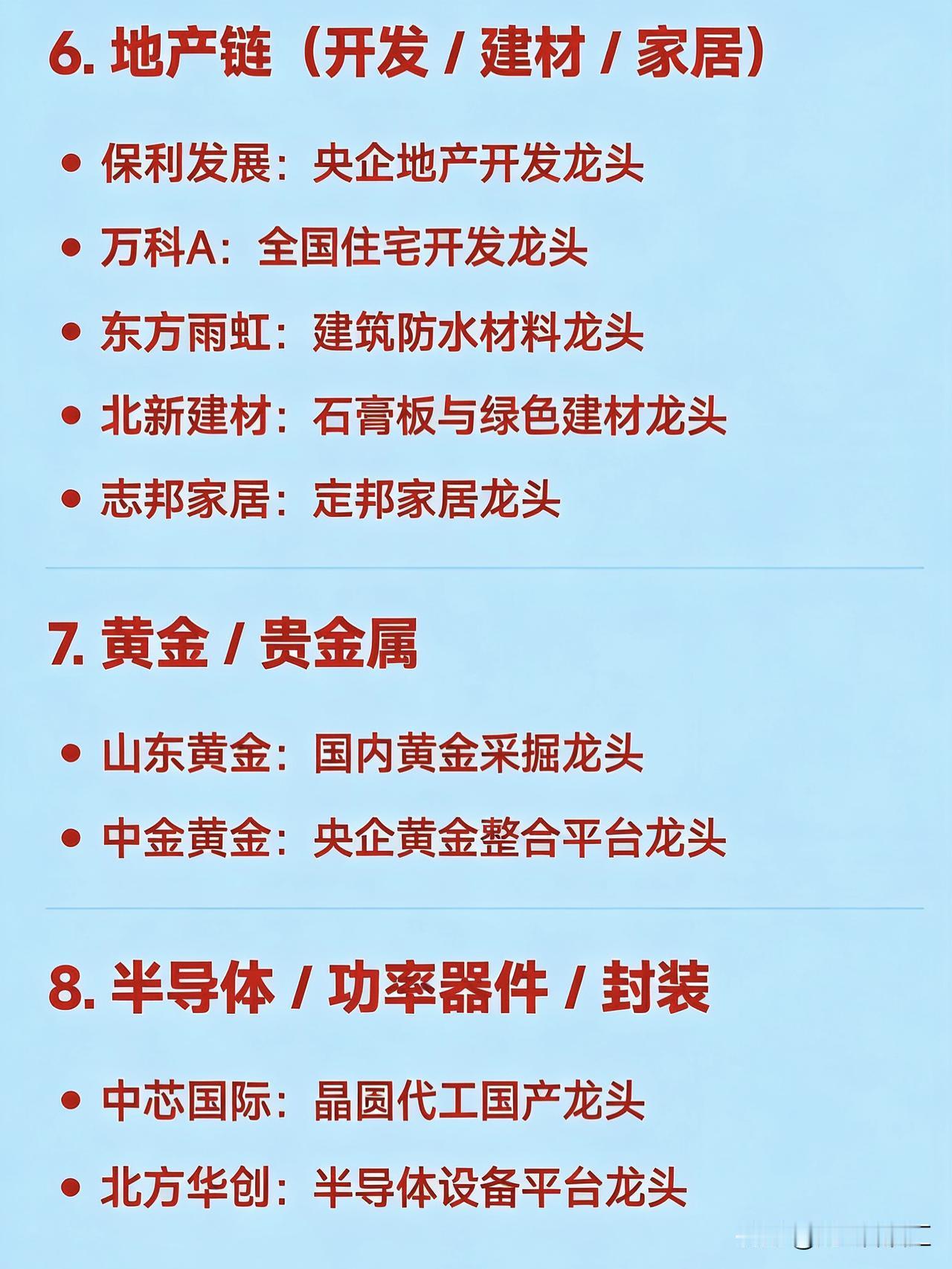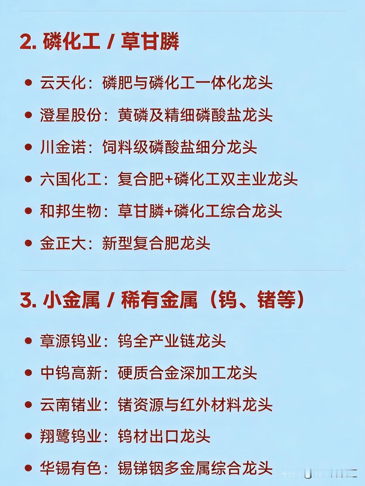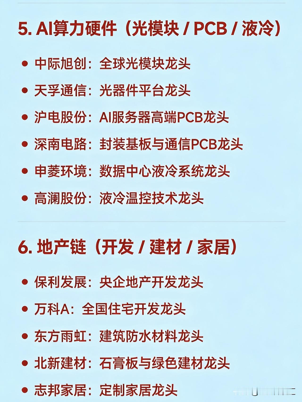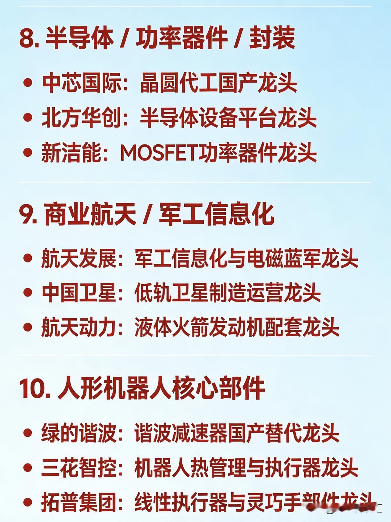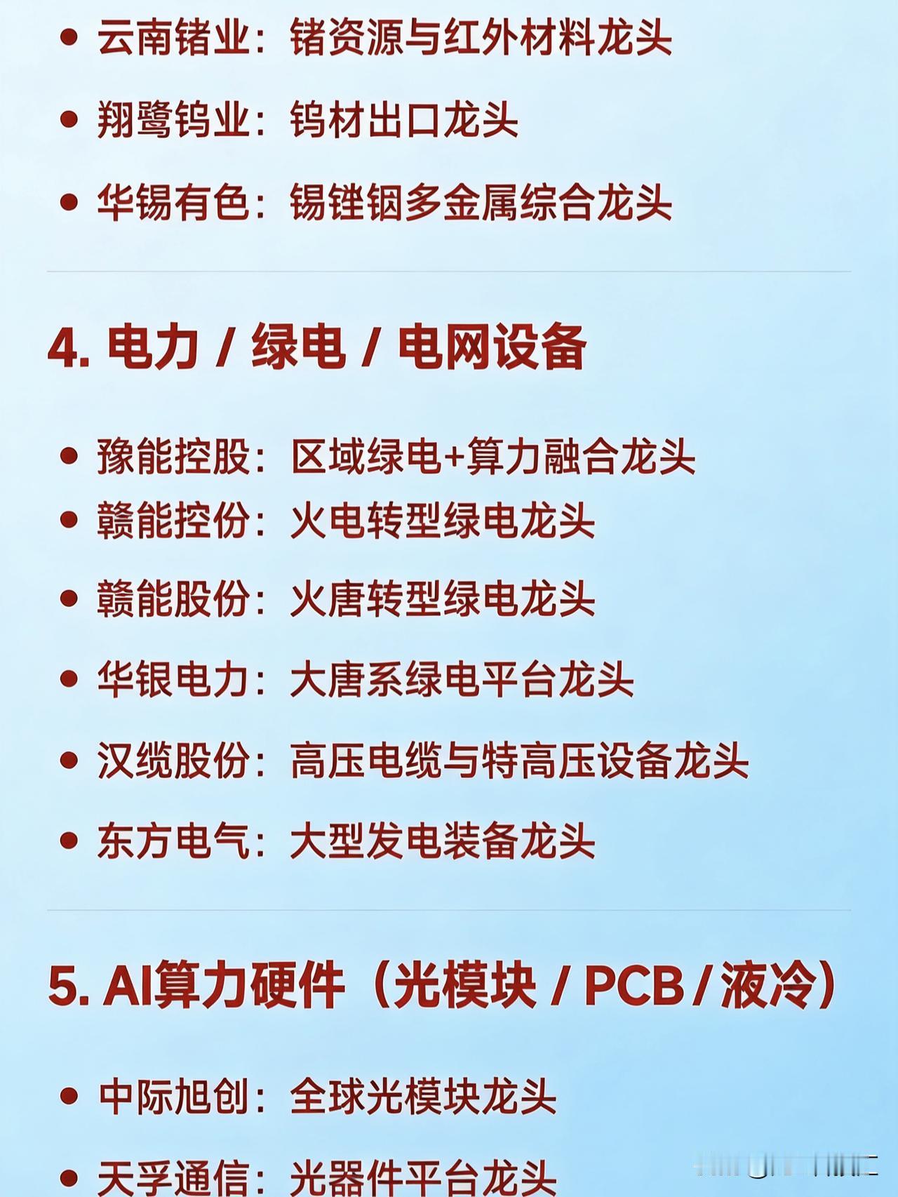 2026年2月26日十大热点科技及其产业链核心龙头 1. 锂矿 / 盐湖提锂 赣锋锂业:全球锂资源龙头 天齐锂业:硬岩锂矿龙头 永兴材料:云母提锂龙头 江特电机:锂云母开发龙头 融捷股份:锂矿采选加工龙头 大中矿业:铁锂资源一体化龙头 金圆股份:盐湖提锂+环保协同龙头 2. 磷化工 / 草甘膦 云天化:磷肥与磷化工一体化龙头 澄星股份:黄磷及精细磷酸盐龙头 川金诺:饲料级磷酸盐细分龙头 六国化工:复合肥+磷化工双主业龙头 和邦生物:草甘膦+磷化工综合龙头 金正大:新型复合肥龙头 3. 小金属 / 稀有金属(钨、锗等) 章源钨业:钨全产业链龙头 中钨高新:硬质合金深加工龙头 云南锗业:锗资源与红外材料龙头 翔鹭钨业:钨材出口龙头 华锡有色:锡锑铟多金属综合龙头 4. 电力 / 绿电 / 电网设备 豫能控股:区域绿电+算力融合龙头 赣能股份:火电转型绿电龙头 华银电力:大唐系绿电平台龙头 汉缆股份:高压电缆与特高压设备龙头 东方电气:大型发电装备龙头 5. AI算力硬件(光模块 / PCB / 液冷) 中际旭创:全球光模块龙头 天孚通信:光器件平台龙头 沪电股份:AI服务器高端PCB龙头 深南电路:封装基板与通信PCB龙头 申菱环境:数据中心液冷系统龙头 高澜股份:液冷温控技术龙头 6. 地产链(开发 / 建材 / 家居) 保利发展:央企地产开发龙头 万科A:全国住宅开发龙头 东方雨虹:建筑防水材料龙头 北新建材:石膏板与绿色建材龙头 志邦家居:定制家居龙头 7. 黄金 / 贵金属 山东黄金:国内黄金采掘龙头 中金黄金:央企黄金整合平台龙头 8. 半导体 / 功率器件 / 封装 中芯国际:晶圆代工国产龙头 北方华创:半导体设备平台龙头 新洁能:MOSFET功率器件龙头 9. 商业航天 / 军工信息化 航天发展:军工信息化与电磁蓝军龙头 中国卫星:低轨卫星制造运营龙头 航天动力:液体火箭发动机配套龙头 10. 人形机器人核心部件 绿的谐波:谐波减速器国产替代龙头 三花智控:机器人热管理与执行器龙头 拓普集团:线性执行器与灵巧手部件龙头