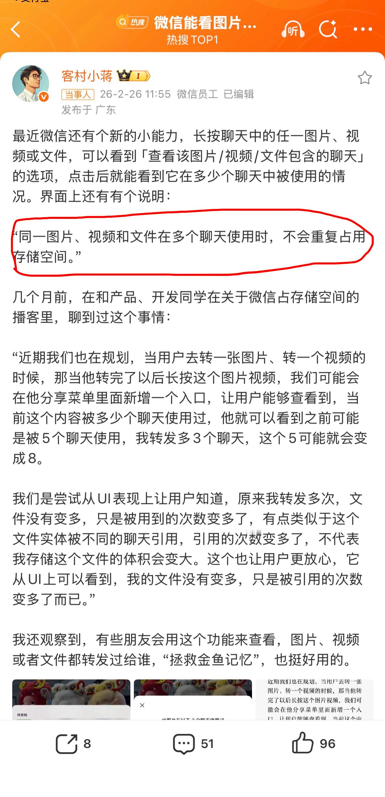 微信能看图片使用次数了这次升级很给力同一张图片,视频,文件在多个群使用不占储存空间,微信的处理能力和空间优化能力越来越强了,给蒋哥点个赞!