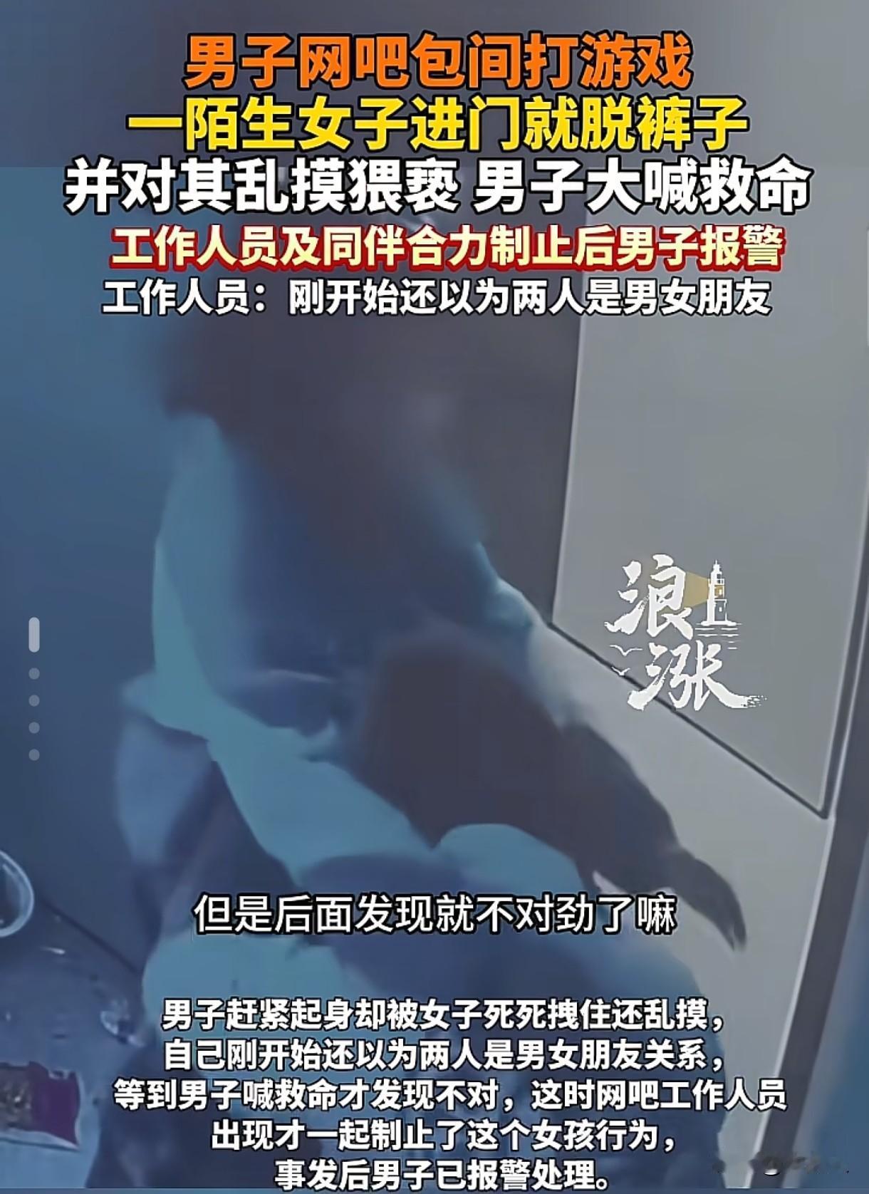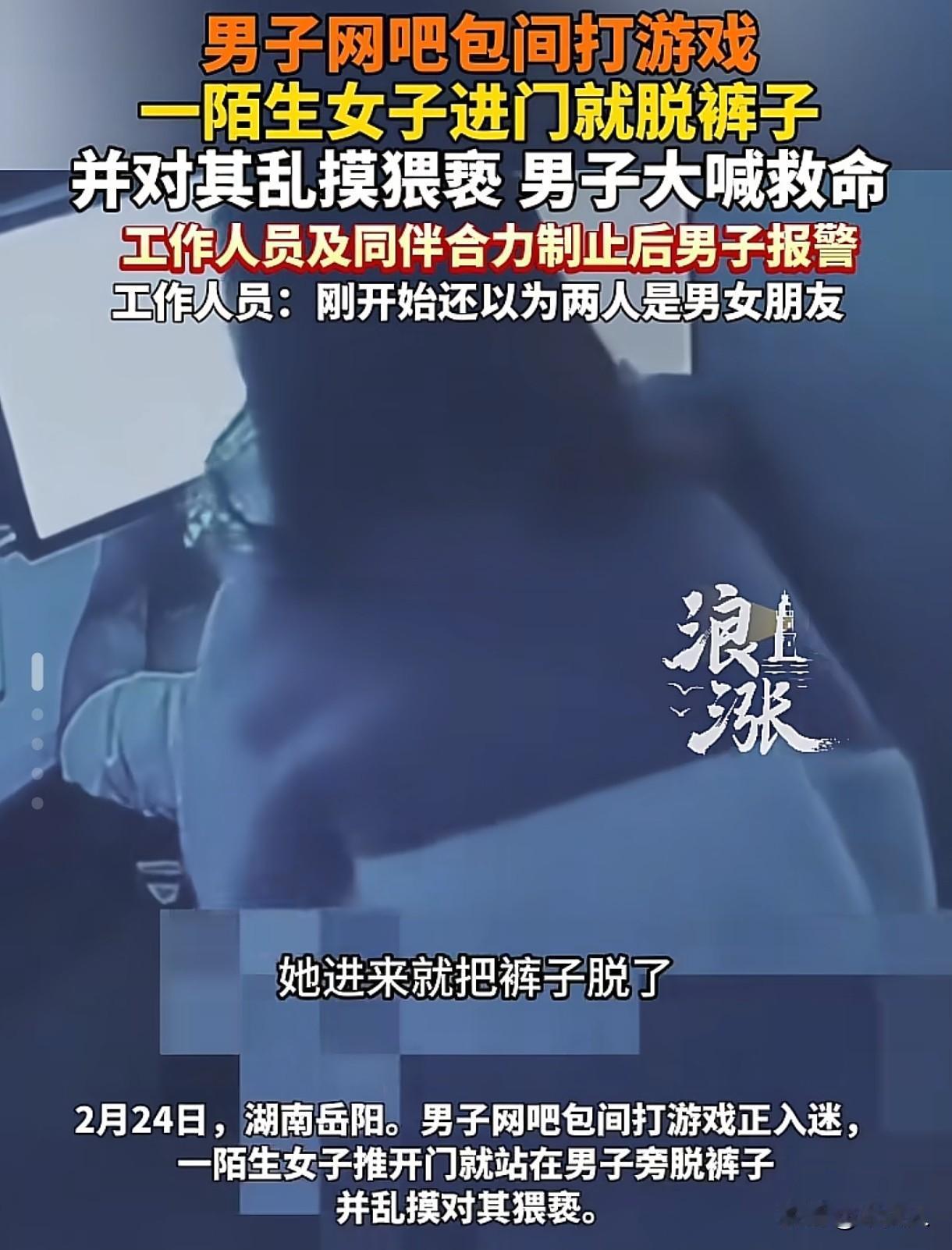 “主动的让人害怕!”湖南岳阳,男子在酒吧包间打游戏,一名陌生女子推门而入,直接脱起了裤子。见男子没反应,女子又出去推了一把椅子,坐下后,把腿放在男子身上,对着男子摸了起来。男子惊恐起身,想要远离女子,可女子紧紧拽着他,工作人员以为他们是男女朋友,也不好多说什么,直到男子喊救命,大家才感觉不对,急忙上前制止。网友:好好保护自己,事出反常必有妖! 据知情人介绍:2月24日,男子是和朋友一起去网吧玩的,两人开了包间,就一起打开电脑,专心致志的玩起了游戏。 不知过了多久,包间的门被轻轻推开了,一个陌生女子走进去后,竟然直接在男子旁边脱起了裤子。 当时男子正玩得起劲,眼睛一直盯着电脑屏幕,手还在疯狂的敲着键盘,加上网吧本就嘈杂,他根本没注意自己身边的动静。 女子见没人理她,又走了出去,拿来了一把椅子,坐在了男子旁边,随后把腿搭在了男子身上,男子被吓得浑身一哆嗦,直接把椅子往后面滑,想着离女子远一点。 可女子紧紧拉着男子的衣服,不让他走,还对他乱摸。 男子吓坏了,猛地站起来,想要推开女子,可对方却像块狗皮膏药似的,死死拽住他的胳膊,他走到哪里,女子跟到哪里。 工作人员看到这一幕,以为两人是男女朋友,这是小情侣之间的打闹嬉戏,也没有上前多说什么。 可直到男子摆脱不了女子,大喊“救命”,大家才反应过来,事情不对劲。 工作人员随即上前,和男子朋友一起合力制止了女子的行为。 事后,男子表示自己不认识这名女子,并报警处理。 有人说:太主动了,事出反常必有妖!这个女子的行为看着就不正常,谁家好人会在公众场合脱裤子、乱摸别人的,这不是她家卧室,想干嘛就干嘛的,这种行为真的离谱到了极点。 还有人说:这个女的是不是喝醉了,不知道自己在干啥? 要是碰到我,绝对给她点颜色瞧瞧,好好的一个姑娘,竟然这么不自爱,一个大男人害怕一个女人,简直不可思议。 也有人反驳说:即使喝多了,也不能成为女子在公众场合,随意脱裤子,乱摸别人、猥亵别人的理由。 从法律角度来看,如果女子精神正常,那么她的行为已经涉嫌违法。 《治安管理处罚法》第44条规定:猥亵他人的,或者在公共场所故意裸露身体,情节恶劣的,处五日以上十日以下拘留。 如果女子神志清楚,故意去做这种事情,或者用这种事情来吸引男子,那么女子需要承担相应的法律责任。 但是,如经鉴定,女子在实施猥亵行为时完全不能辨认或控制自己的行为,则不负刑事责任。 如果女子精神不正常,那么会要求其监护人或家属必须严加看管和医疗。 在必要时,政府可依法对其实施强制医疗,以保障社会安全和其自身健康。 无论女子是否需要承担刑事责任,她的行为都可能给受害者带来身体和心理上的伤害,受害者有权要求女子或其监护人承担民事赔偿责任,包括医疗费、精神损失费等。 《民法典》第1188条规定:无民事行为能力人、限制民事行为能力人造成他人损害的,由监护人承担侵权责任。监护人尽到监护职责的,可以减轻其侵权责任。 若女子患有精神疾病,属于无民事行为能力人或限制民事行为能力人,那么由其监护人承担赔偿责任。 如果家里有类似病人的,一定要监护到位。 有人调侃,遇到这样主动的女子,男生出门在外,也要保护好自己,以免入了别人的圈套,或者遇到不好的事情,如对方有传染病等。 对此,大家怎么看?