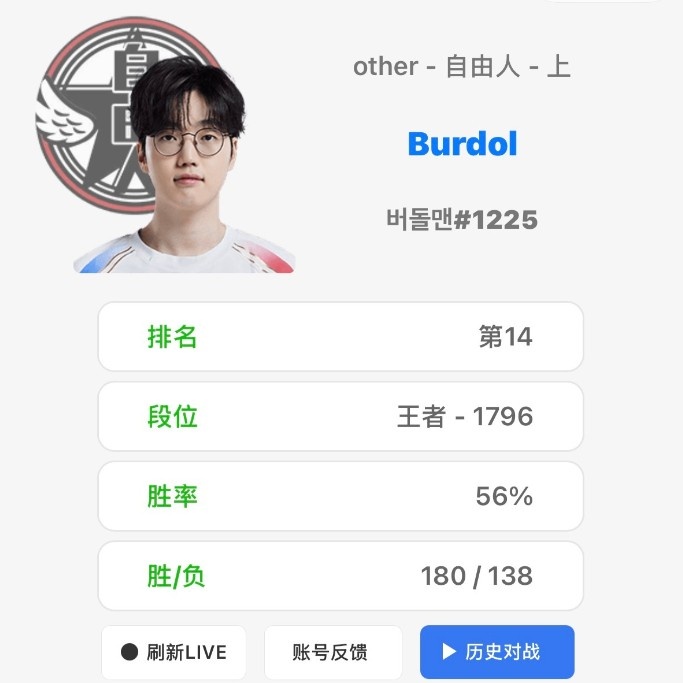 Burdol离开LPL后辗转去过LTA的IsurusEstral战队和LCK的NS二队,目前排韩服第14。