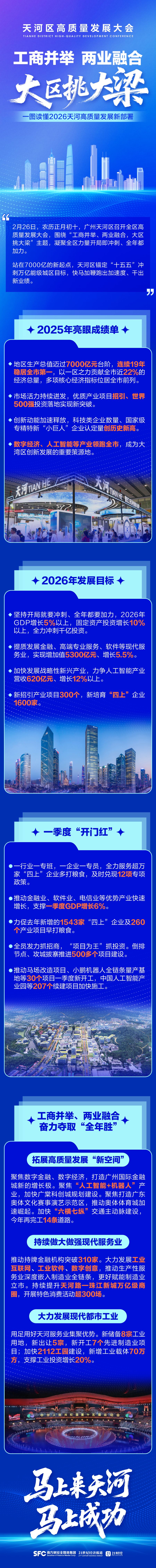 2月26日,继省、市高质量发展大会后,广州天河区在南方财经大厦召开全区高质量发展大会,聚焦“工商并举、两业融合,大区挑大梁”主题,吹响集结号,发出动员令。