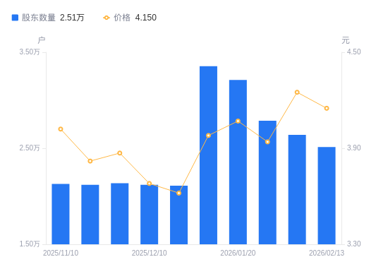 日期A股户数(户)流通A股户均持股数(股)户均持股市值(万元)2026-02-132512320382.288.462026-02-102640519392.698.242026-01-302786418377.267.242026-01-203211615944.206.492026-01-103355115262.266.072025-12-192110824259.248.782025-12-102119724157.388.892025-11-282136223970.799.282025-11-202119524159.669.232025-11-102129424047.349.67