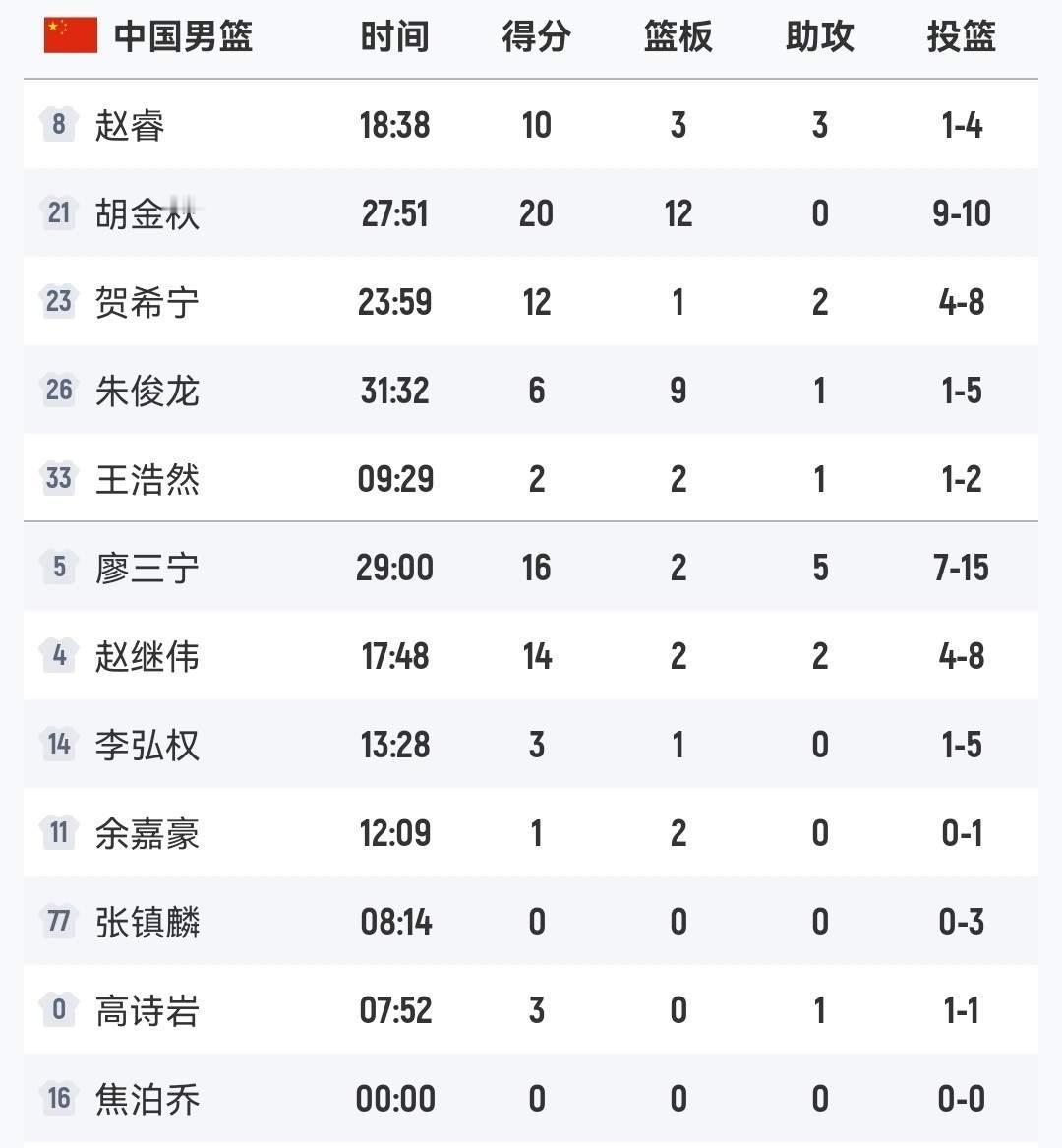 今晚的MVP,胡金秋首发登场,砍下20分12板,最后时刻一个前场篮板再加爆扣,杀