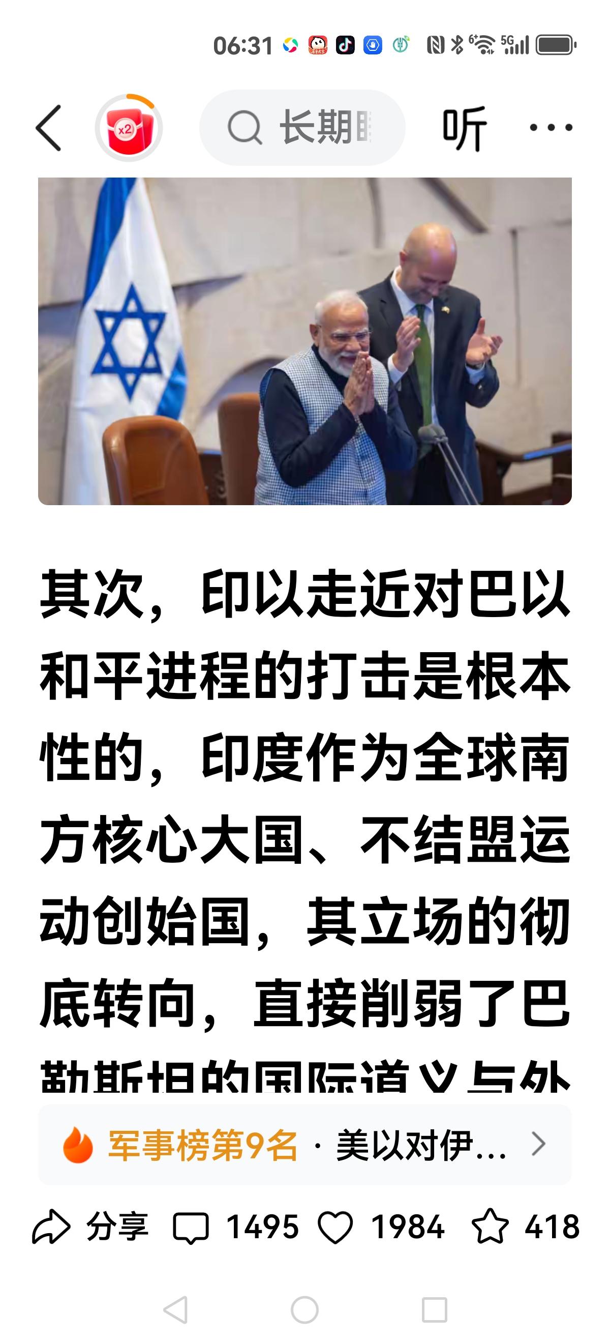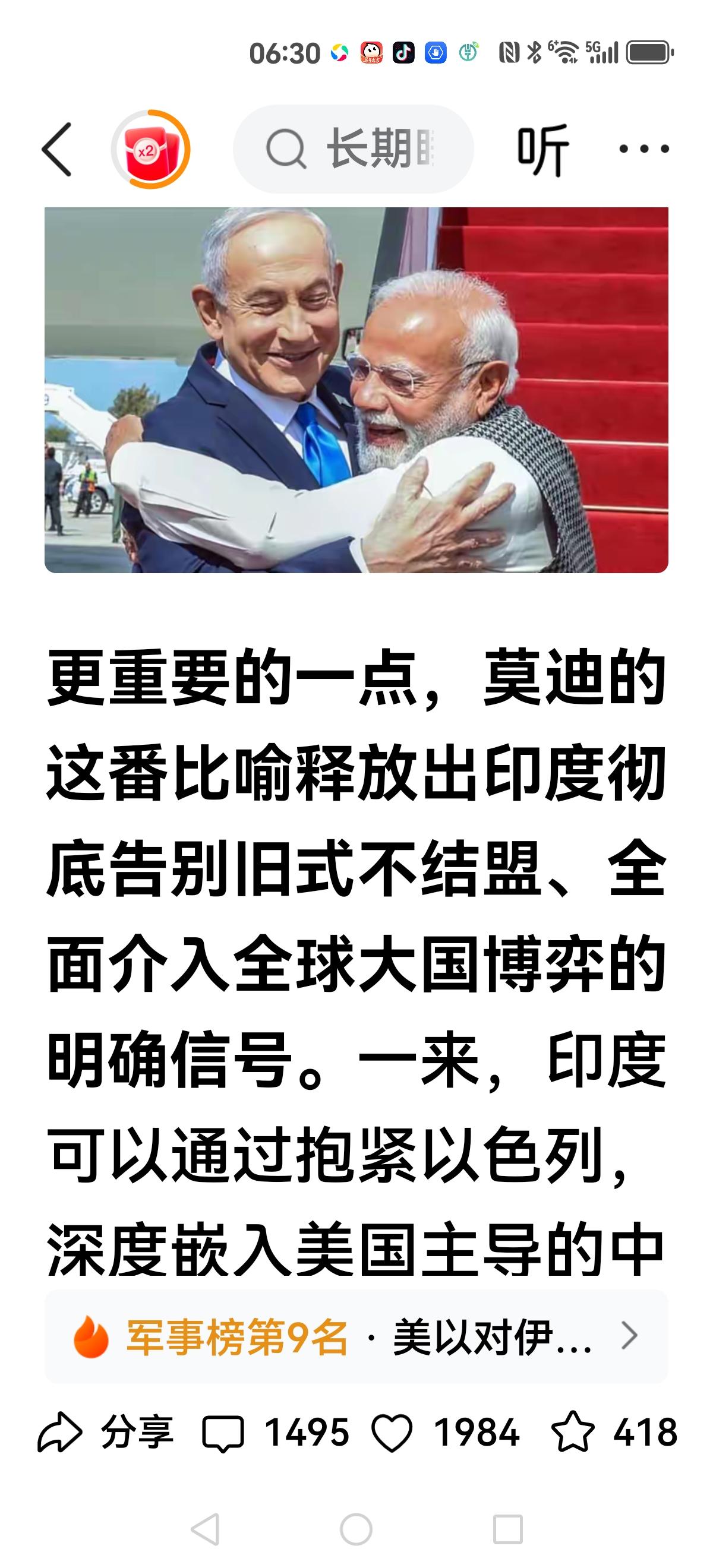 【印度与以色列,一公一母,标志印度要登上历史舞台】 访问结束的莫迪,在离开以色列登机前,公开宣布以色列是父国,印度是母国,给外界强烈信号,印度不但站队,而且还要插手国际事务。 要说印度过去脚踏两只船,在两个大国之间游刃有余,随着俄罗斯日渐衰落,印度终于露出獠牙,美印以这个中轴线已经公开表白了。 暗示印度未来加强芯片赋能所有领域深化,依靠美以的高科技引领。 对国际事务要深度介入,尤其这一次敏感点访问以色列,对伊朗形成左右夹攻之势。 对亚洲形势也有深远的影响。